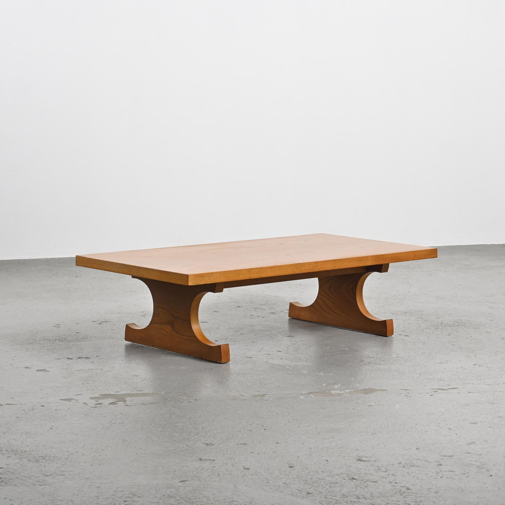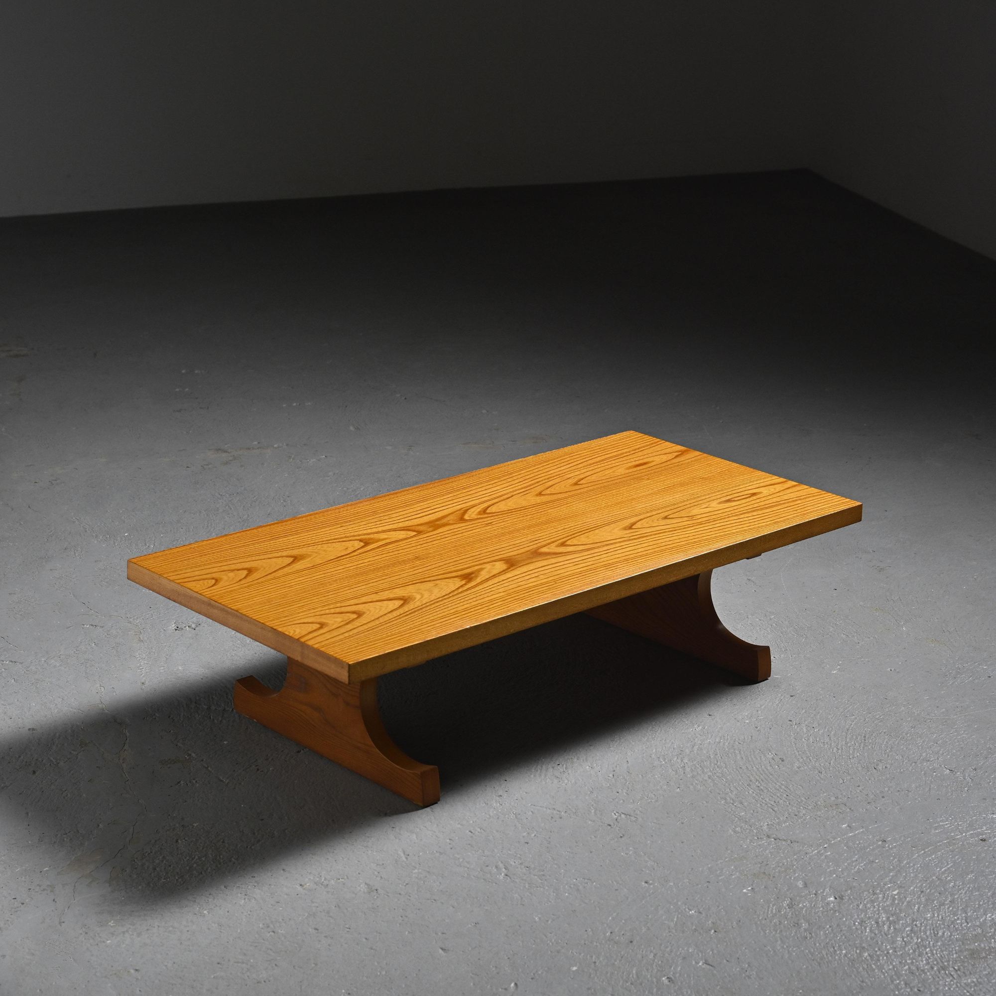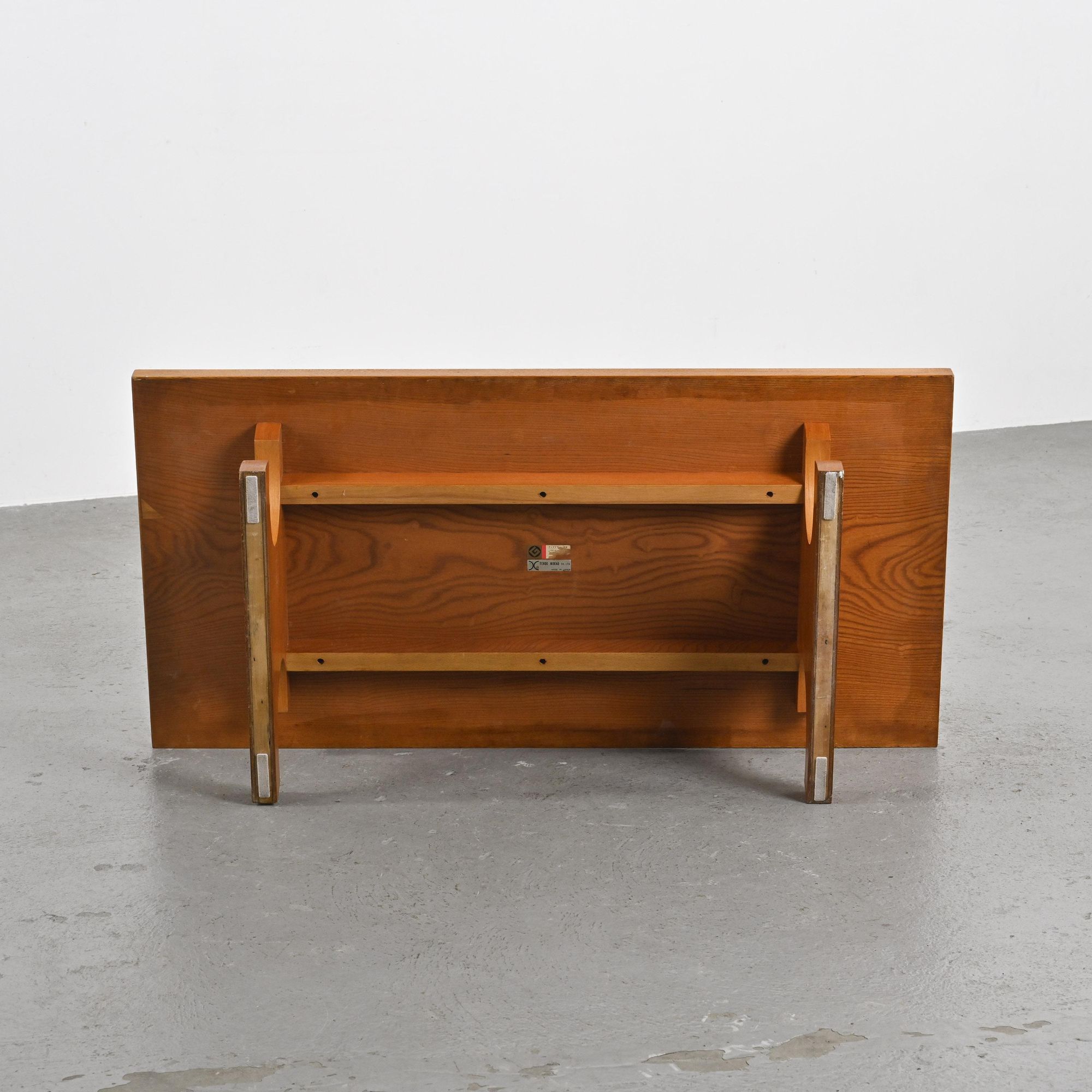 This table is distinguished by its two sculpted side supports holding a thick rectangular top, all in Keyaki wood. Designed with simplicity and balance in mind, it perfectly embodies the formal language developed by Isamu Kenmochi within the Japanese modernist movement. Originally intended for traditional interiors, it was notably used in the rooms of the Atami Garden Hotel and is also known as the "Japanese-style desk." Its low height and open structure make it a functional piece, adaptable to various uses.