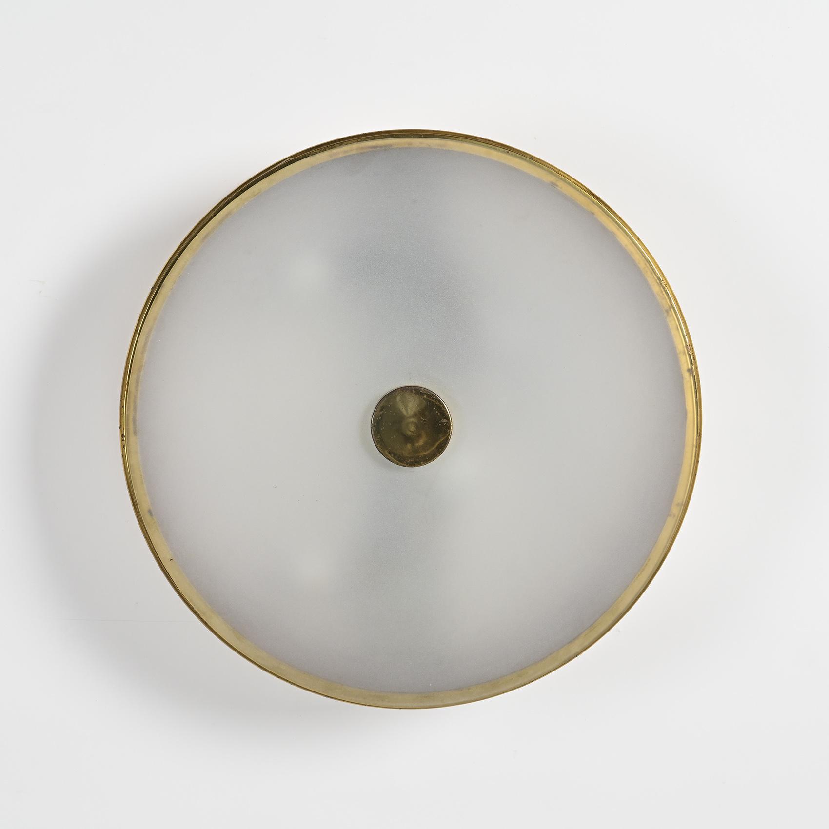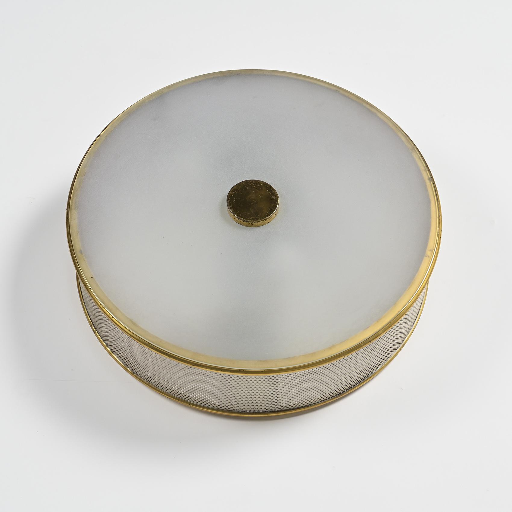 Each piece features a cream-lacquered perforated metal frame edged with gilded brass. The opaline rhodoid diffuser casts a warm and even light, illustrating Lunel's mastery of domestic lighting in 1950s France. A central polished brass fitting completes the design, emphasizing the geometric precision and understated elegance typical of the house's creations.