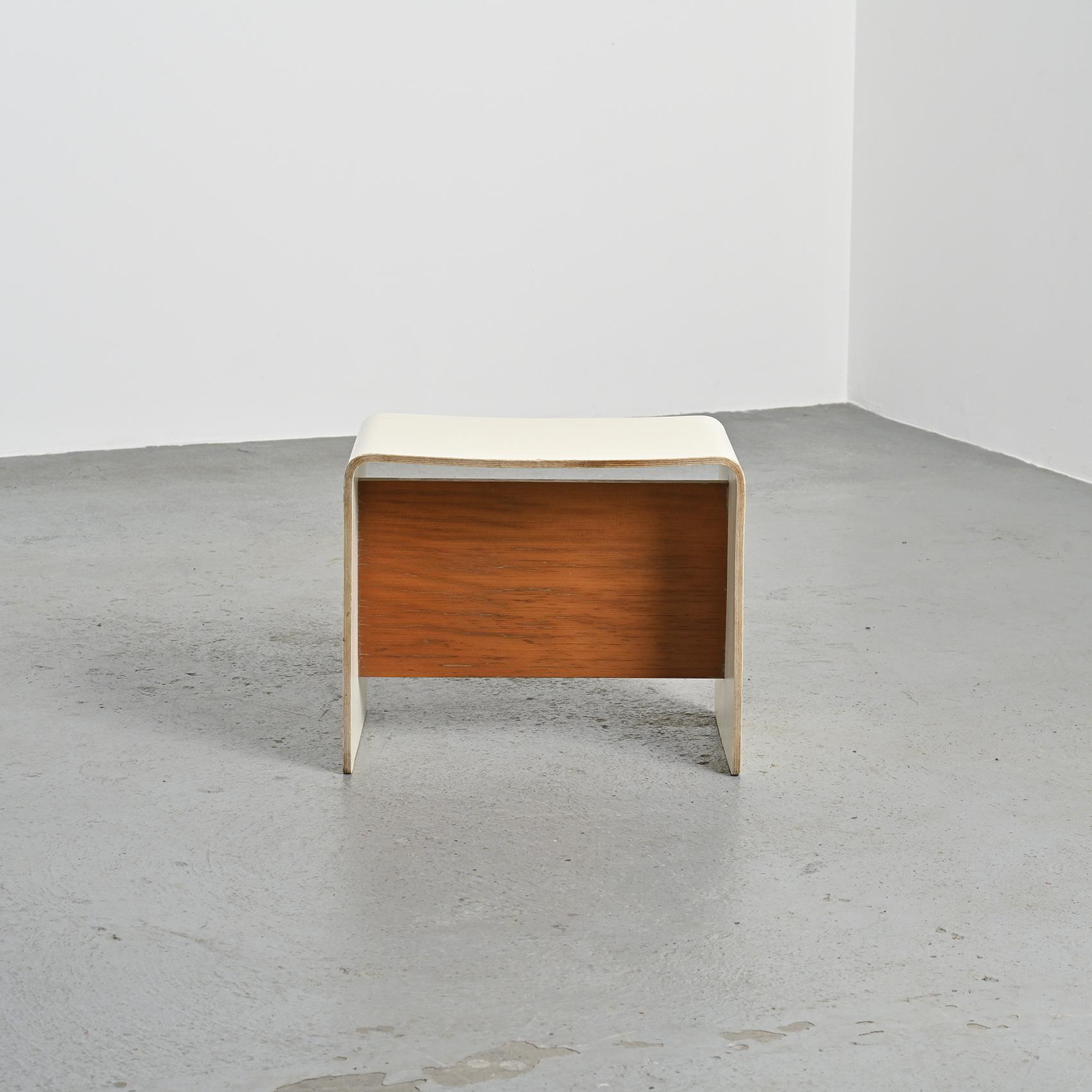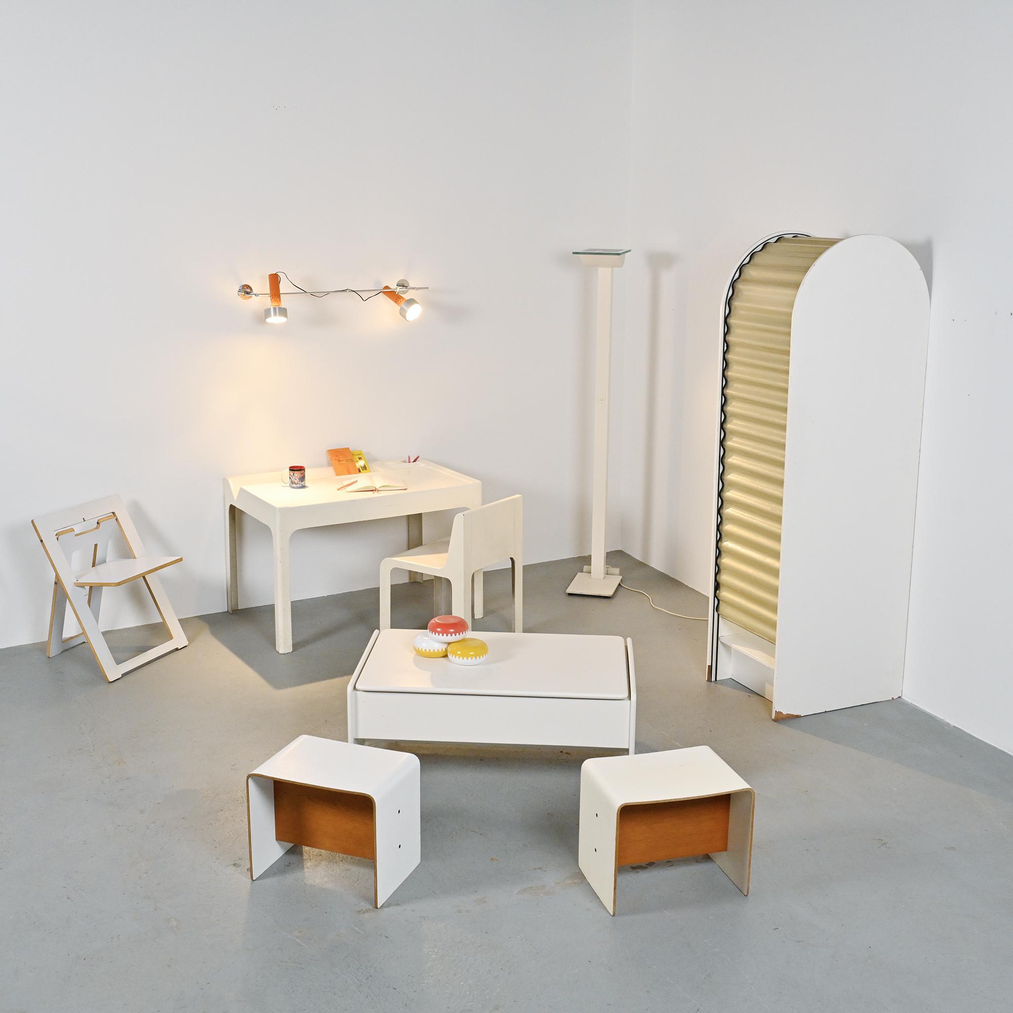 Made from U-shaped bent plywood finished with white laminate and joined by a veneered wood stretcher, these pieces embody Guariche's quest for simple, functional design suited to mountain interiors.