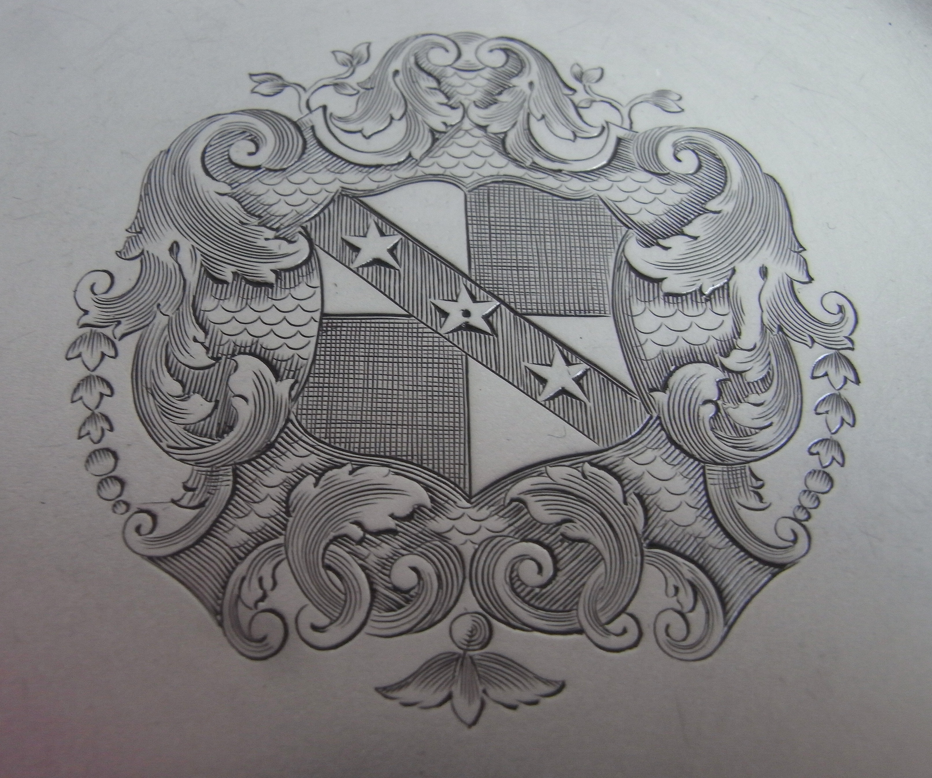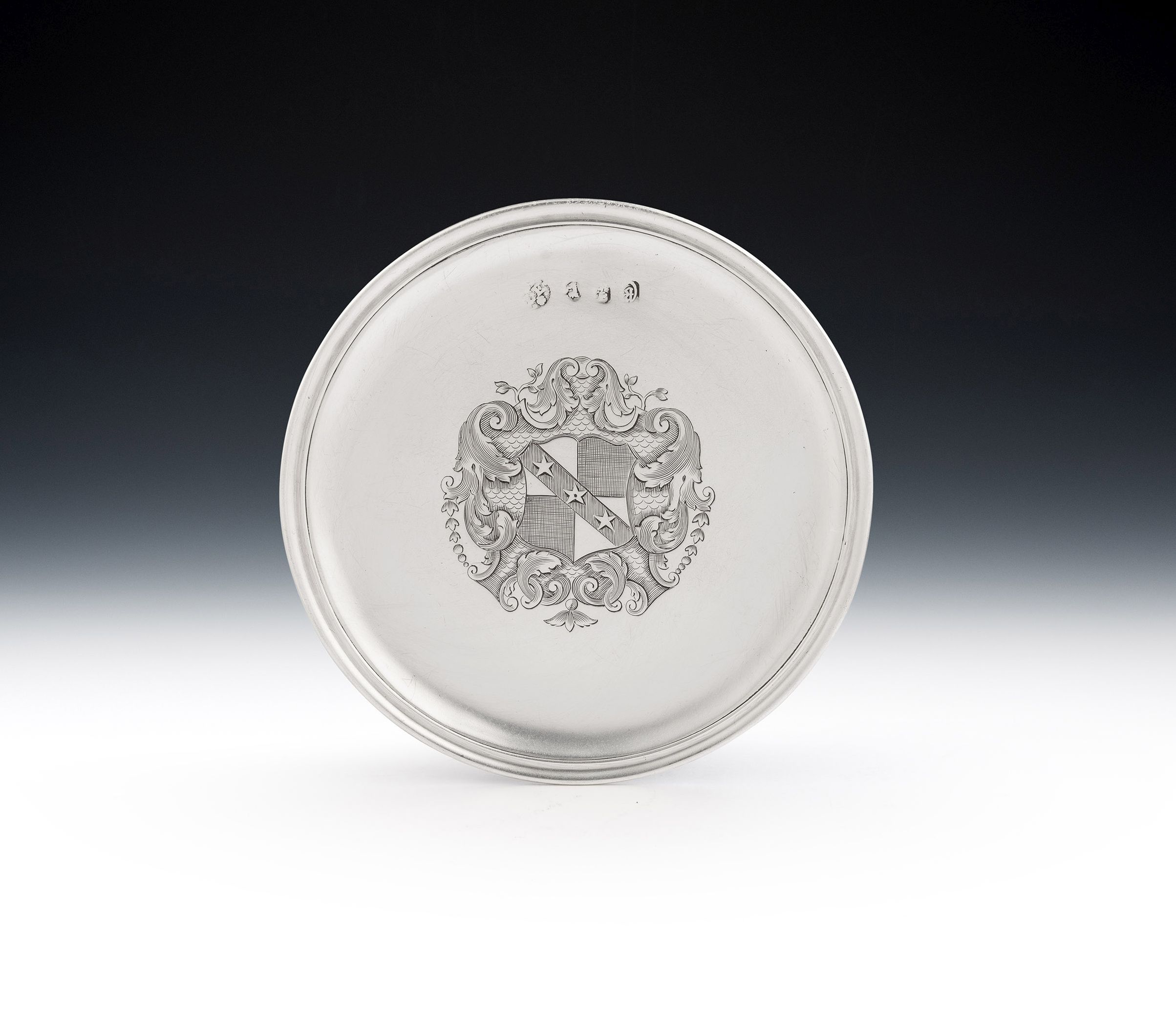 The Arms are those of the ancient family of Caley who had seats at Brompton Hall and Wydale House, both County Yorkshire. The underside is also engraved with their original scratch weight and the top displays a centre point which is always a sign of quality production, as the silversmith has taken the time to measure the piece out to make sure it is perfectly circular when made.