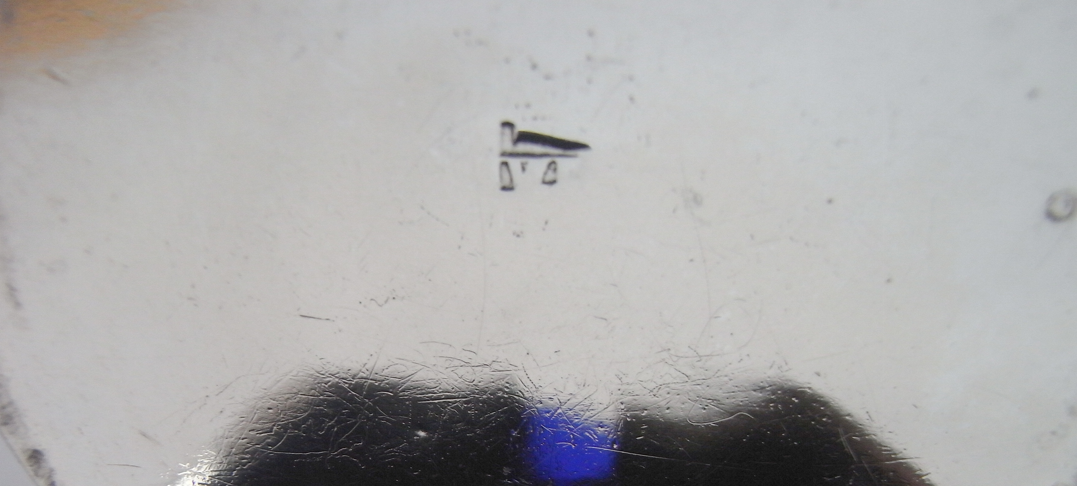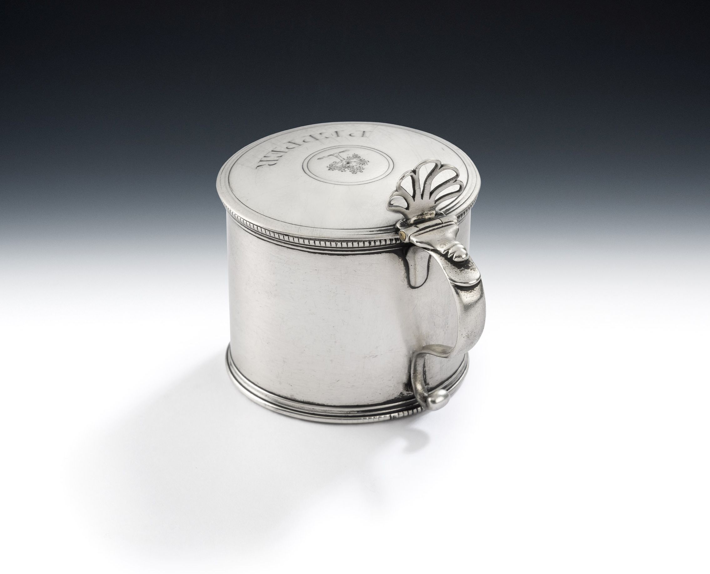 This rare pot is modelled in the plain drum form, with a reed and bead base and a beaded rim. The cover is engraved with an outer reeded border and a central circular cartouche engraved with a Crest. The cover is also engraved with “PEPPER”. This example has a pierced fan shaped thumb piece and scroll handle. The pot has a blue glass liner and is marked on the base and the cover with the maker’s mark of William Lestourgeon. As well as being used for mustard, these pots can be found very occasionally engraved for PEPPER and would have been used for this purpose. Lestourgeon had workshops in Mouldmaker Row, St. Martin’s Le Grand when this piece was made. He also made very fine Snuff Boxes, often of innovative design.