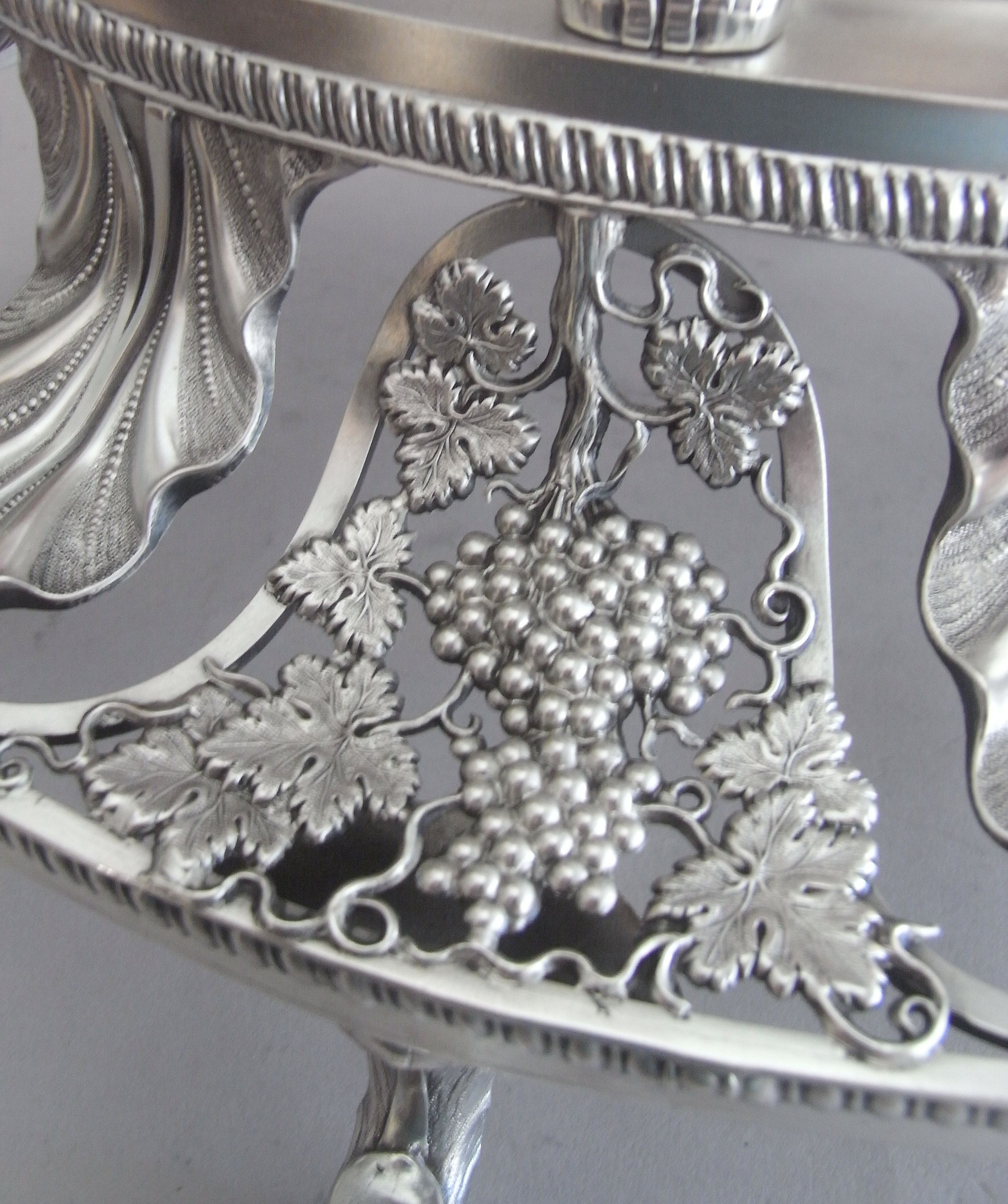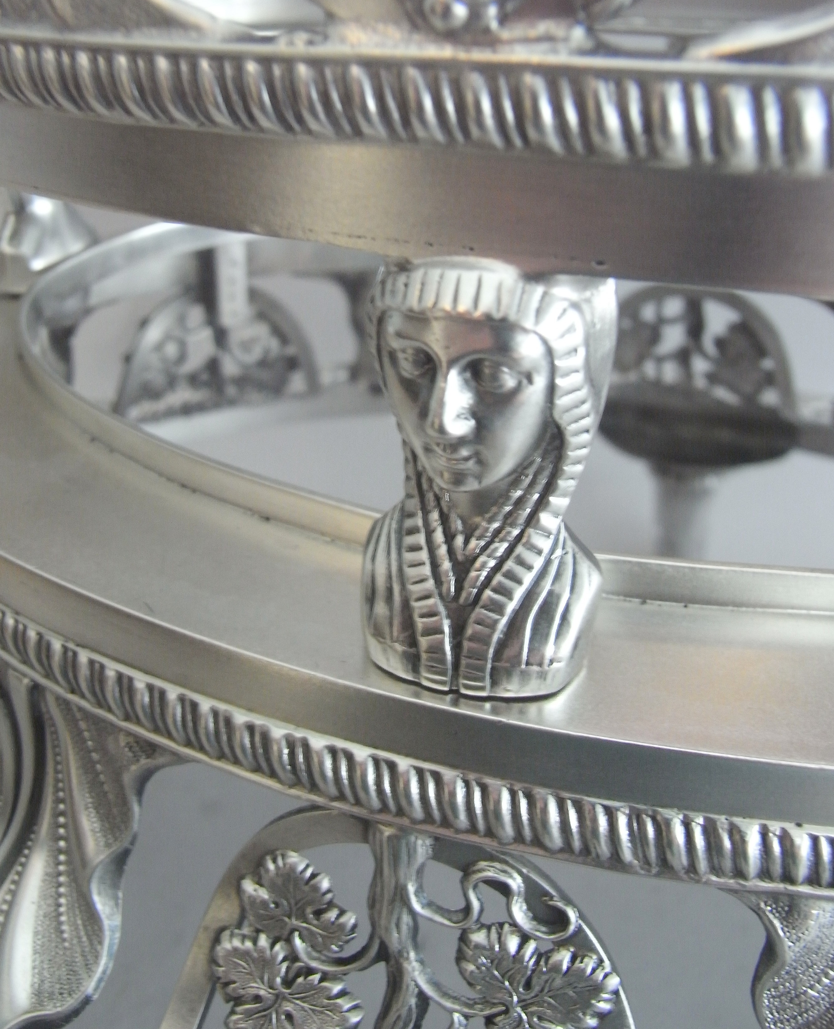 The main body of the centrepiece stands on four unusual detailed eagles head feet decorated with leaf capping. The lower section of the open work frame is decorated with large matted foliate motifs and pierced frames containing trailing vines and grapes. The decoration is all enclosed by horizontal gadrooned bands. The upper, removable, section of the frame stands on four female figure supports wearing headdresses and with platted hair under their chins. This is all below another pierced band of foliate motifs and trailing vines, as seen on the lower base. This section rises to the neck which is decorated with a raised band of trailing fruiting vines. The four arms terminate in an oval platform, where the glass dishes sit, held in place by a dragon's head, its tail coiled around the arm. Each arm fits into the main body and has a diamond and star cut glass dish. The large central glass dish is also decorated with star and diamond cutting and sits in the oval at the top of the frame. The centre piece is in excellent condition and is very well marked on all six components.