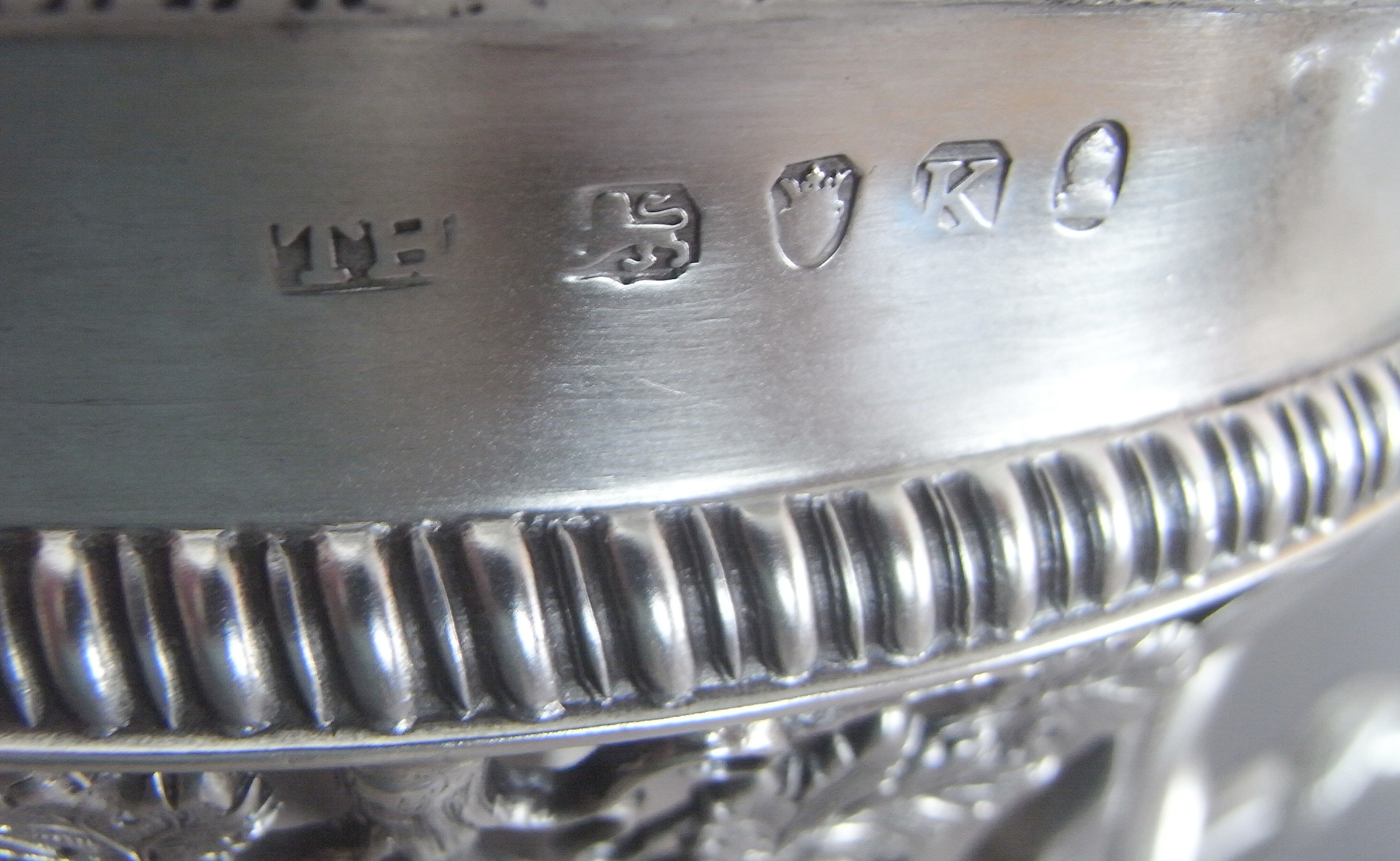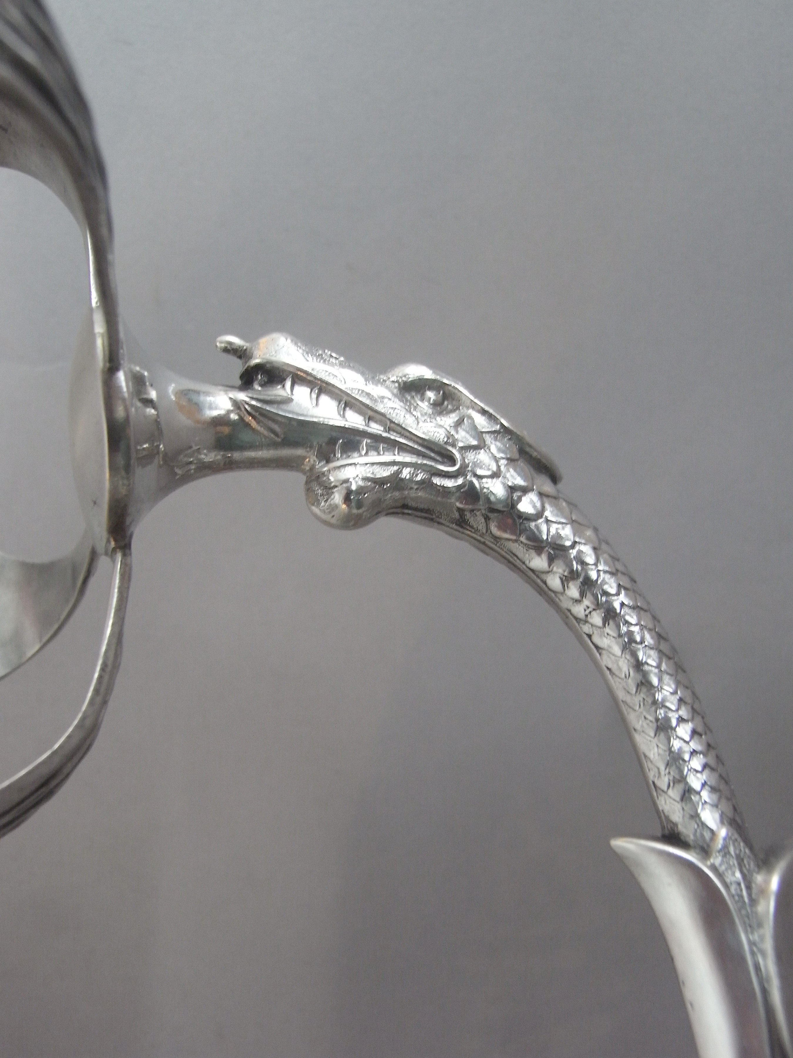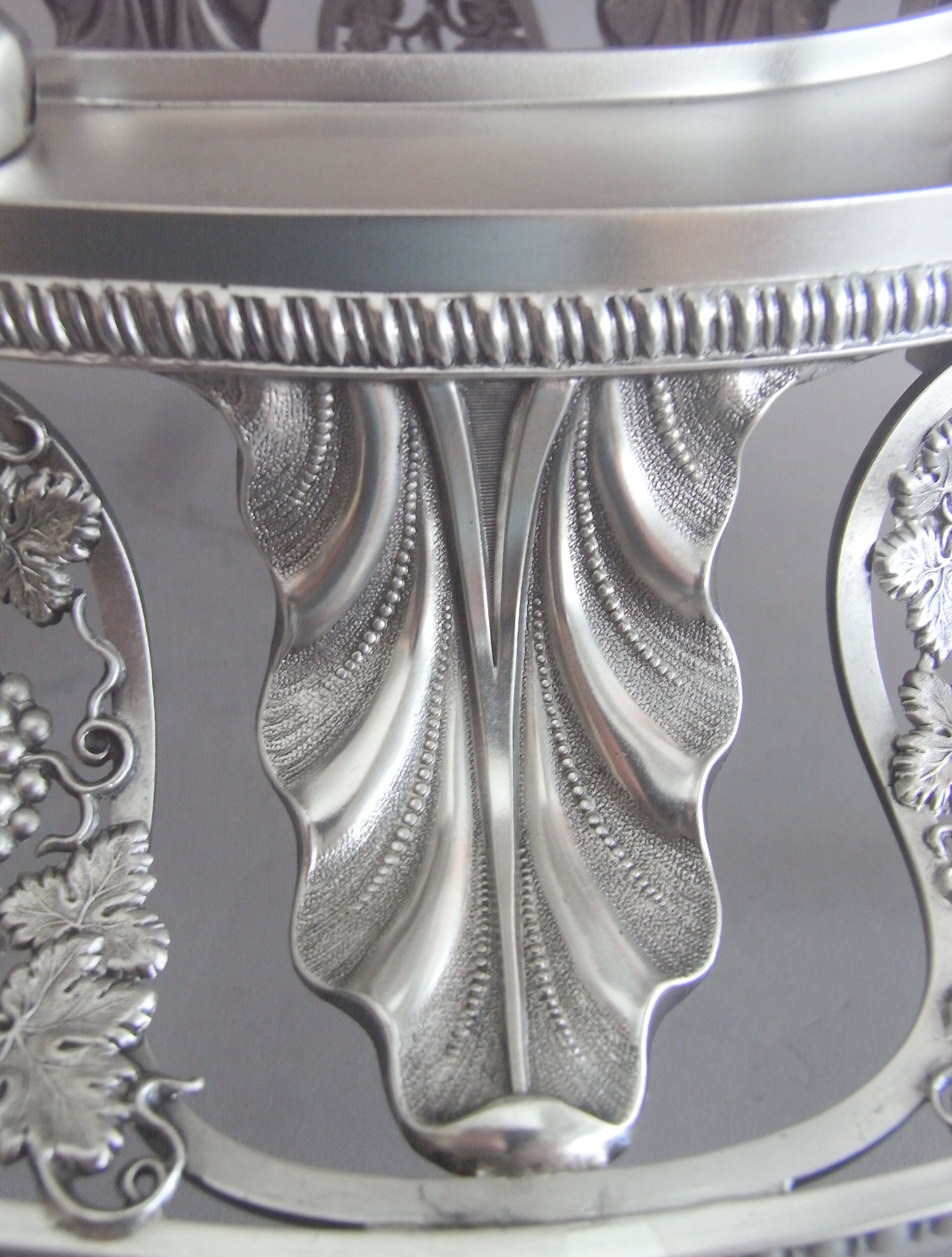 The design of this piece could probably be the French born J.J. Boileau, a mural painter, who came to England to assist Henry Holland in the decoration of the Prince of Wales's Carlton House. Boileau later turned his hand to silver design and his work shows a debt to the French goldsmith, Henri Auguste. Among Boileau's designs are works executed in the full blown Egytian manner, likely encouraged by publications such as Vivant Denon's, "Voyages dans la Basse et la Haute Egypte", 1802. Boileau's drawings are now in the collection of the Victoria & Albert Museum in London. His designs are discussed in "J.J Boileau, a forgotten designer of Silver", Connoisseur Magazine, June 1978. One characteristic of his designs are the inclusion of a very detailed female head moulding with platted hair tied under the chin. This was a characteristic of Boileau's designs and is rather regarded as a signature to one of his pieces.