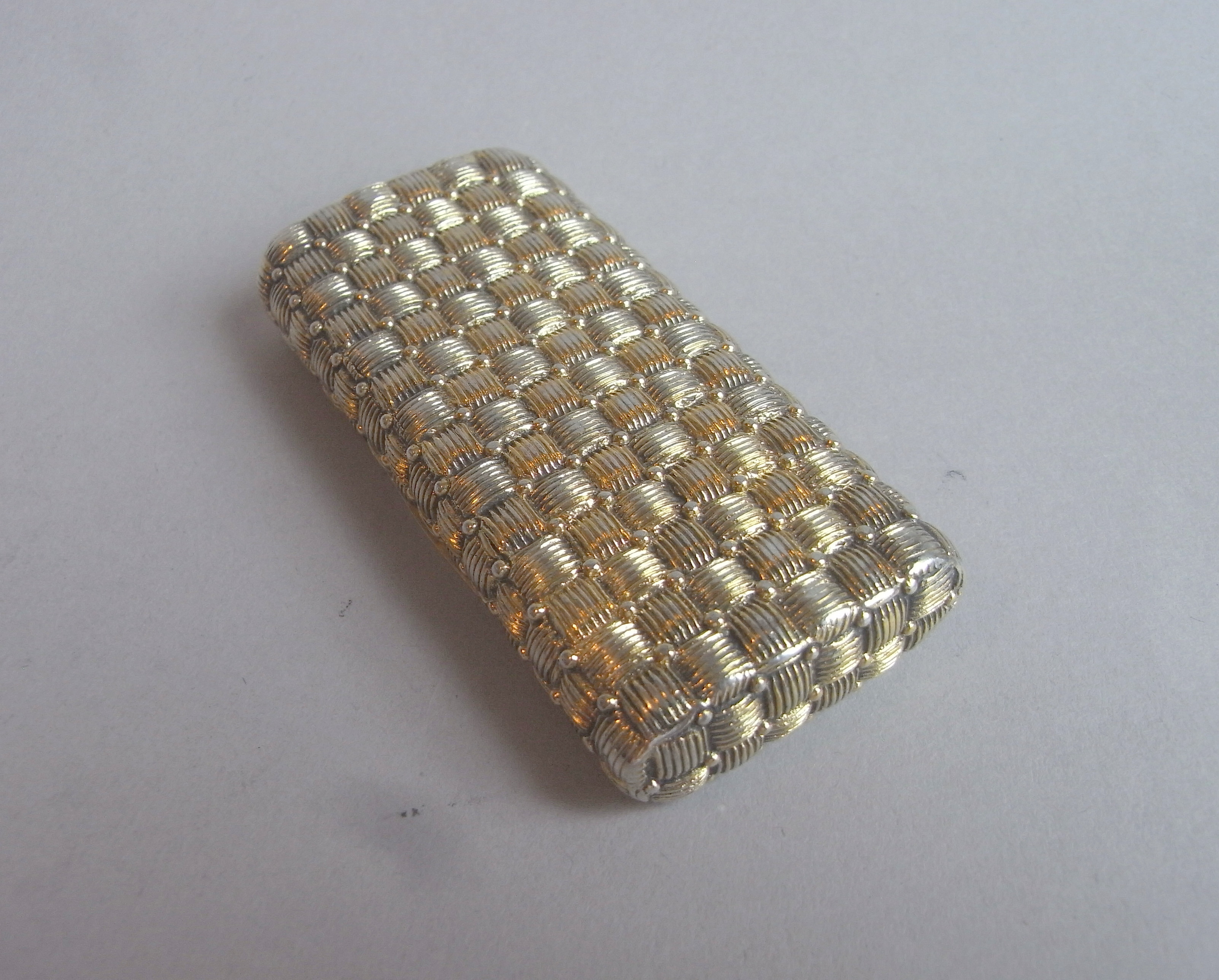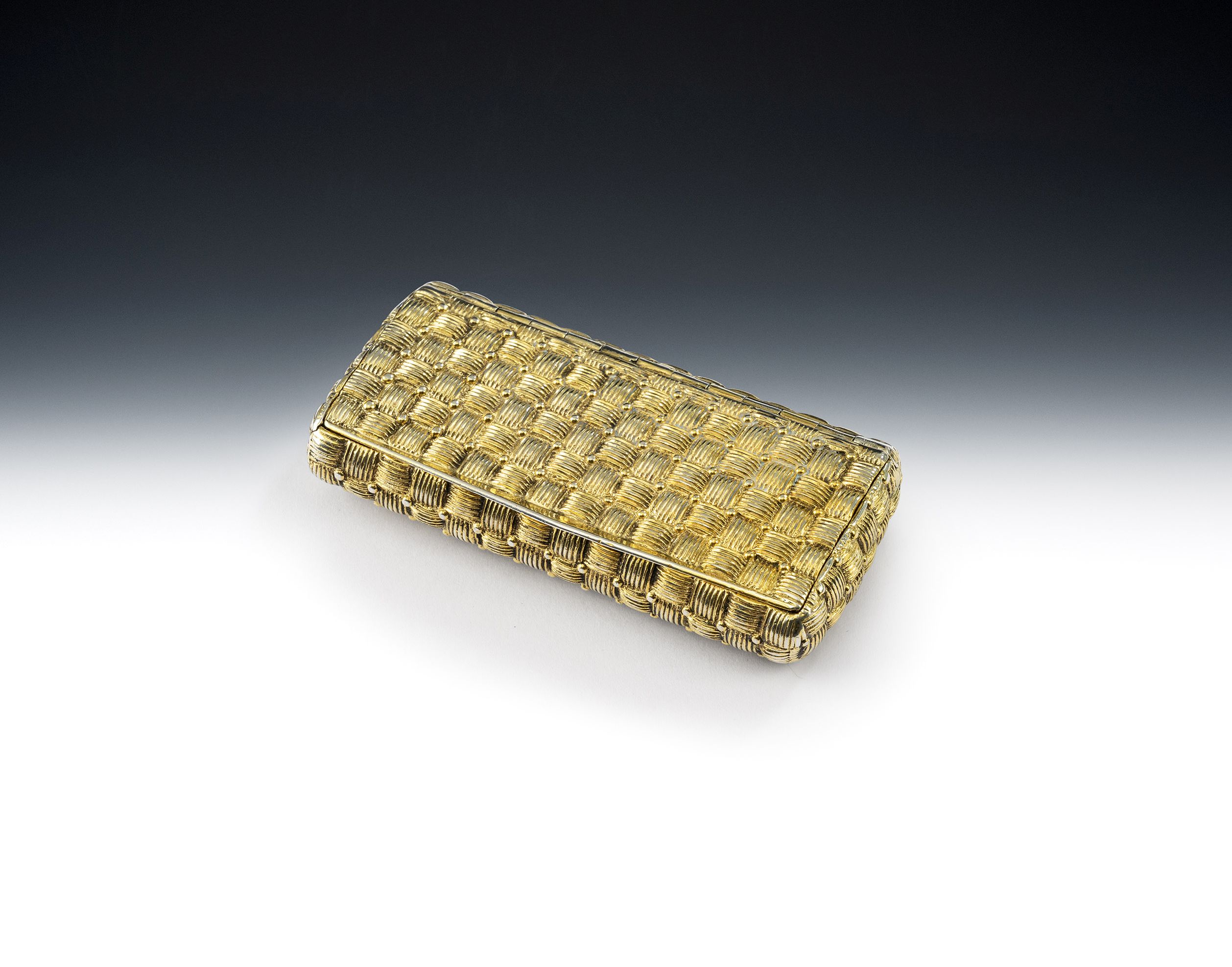 This exceptional example is palely gilded and is unusually cast. The box has a slightly rounded form and is decorated all over with basket weave designs. The basket weave has niello in the design to highlight the patterning. The interior displays fine original gilding and this example is marked on the bezel. This is almost certainly the finest basket weave box we have offered over the years and it is in excellent condition. Cast pocket Snuff Boxes are rare and this is certainly the heaviest we have offered. A very fine box, by this fine specialist box maker.