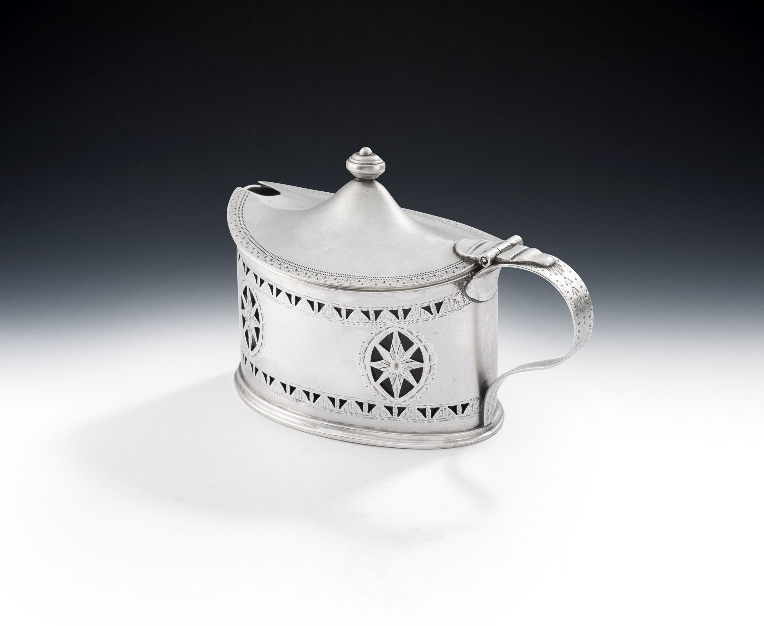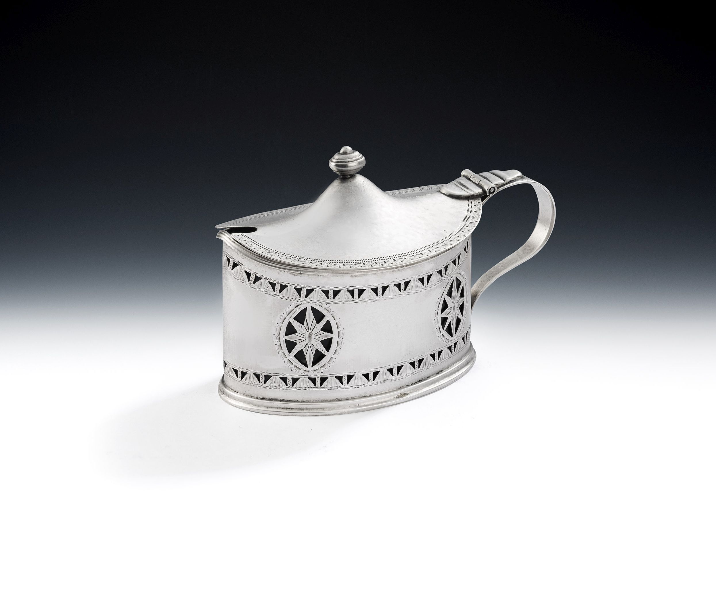 The Mustard Pot has an oval form and is pierced with an upper and lower band of stylised foliate motifs, with raying flower heads in ovals between. The piercing is also surrounded by prick dot and bright cut engraving. The domed cover rises to a stylised urn finial and displays a bright cut border around the outer edge. The plain scroll handle is also engraved with bright cut and prick dot designs. The Mustard Pot is in excellent condition, has a blue glass liner, and is fully marked on the base. This piece is desirable as it was made at the beginning of the establishment of an assay office in Sheffield. This centre was known for producing pretty Classical pieces at this date, however Mustard Pots were not made in great quantity and to find a Sheffield example is rare.