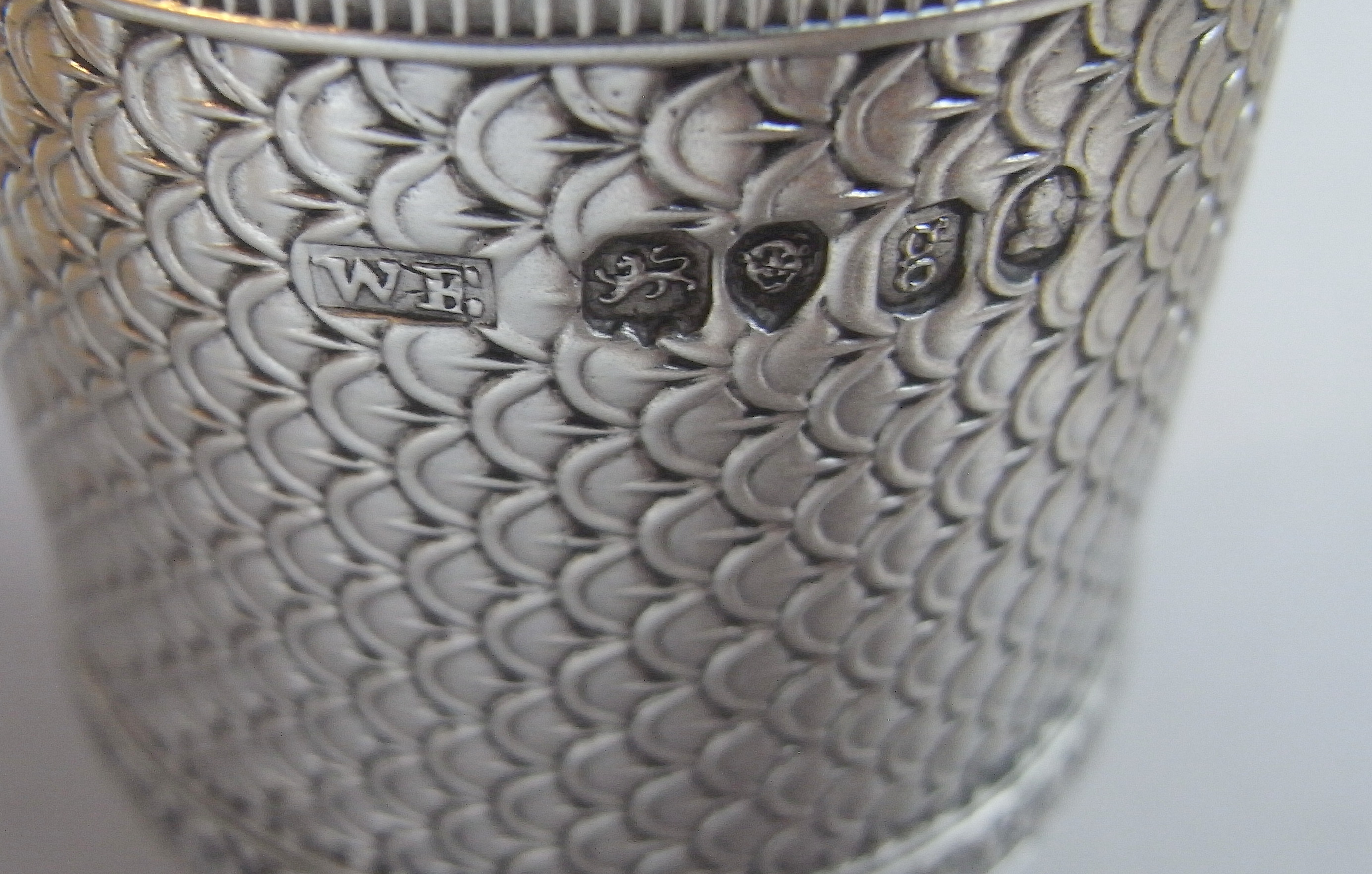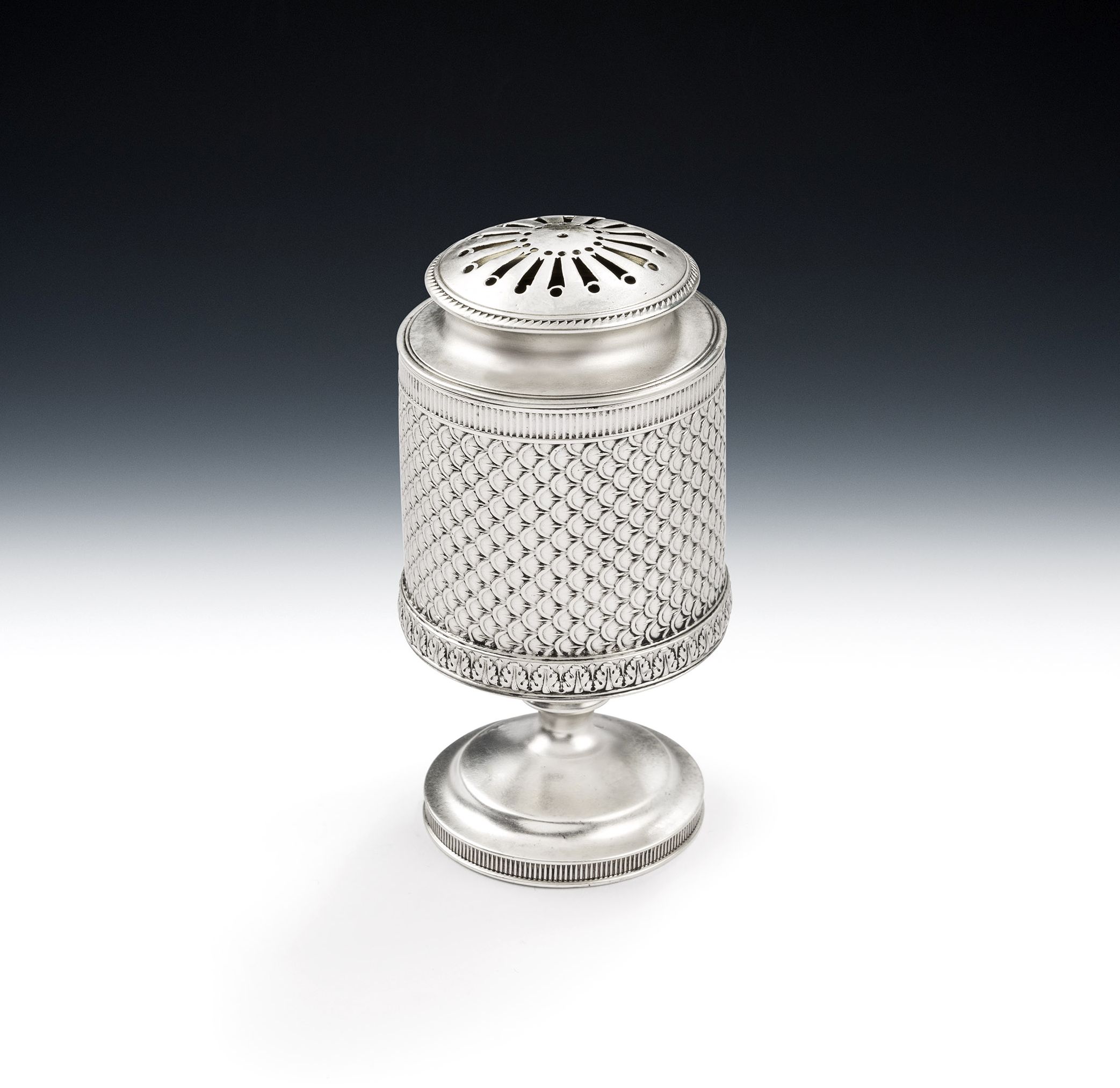 This very rare Pepper Caster stands on a circular pedestal foot decorated with a band of linear designs. The cylindrical main body is most unusually decorated with scale work and a lower horizontal band of foliate spears, in addition to the same band of linear designs as seen on the foot. The pull-off cover has a domed central section pierced with vertical bands and roundels. The pepper is in excellent condition and is fully marked on the main body, as well as the cover.