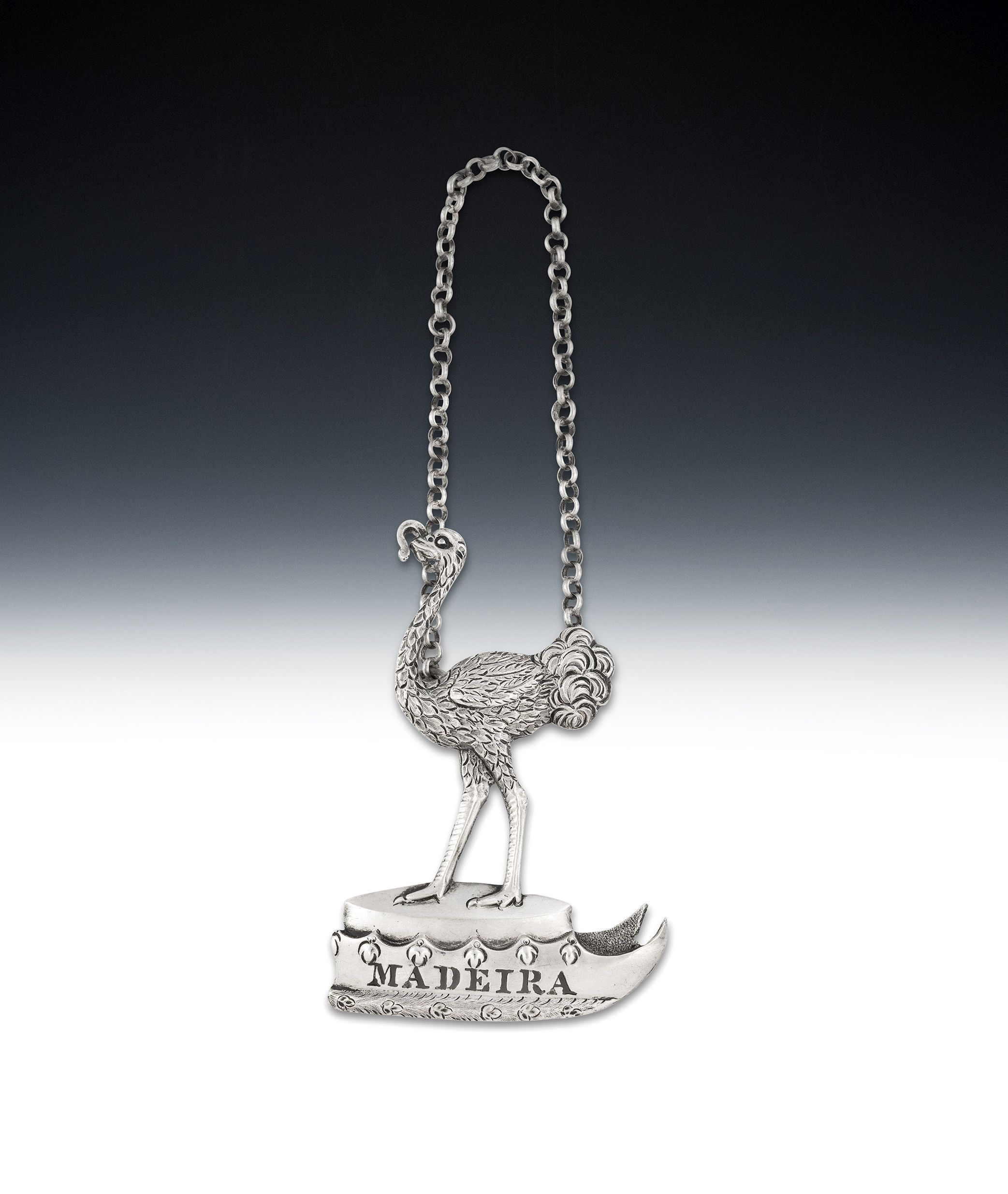 The label is cast and modelled as an ostrich on a chapeau with a horseshoe in its mouth. The modelling is exceptional and the surface textured to simulate the feathers of the bird. This example is pierced for MADEIRA and is modelled as the Crest of the Coke family, Earls of Leicester of Holkham Hall, Norfolk. It is that as used by Thomas William Coke (1754-1842) who, in 1837, was created 1st Earl of Leicester of the 7th creation. Identical examples for SHERRY and PORT are shown in "Wine Labels - A Worldwide History" on pages 94 and 98. This piece is in excellent crisp condition.