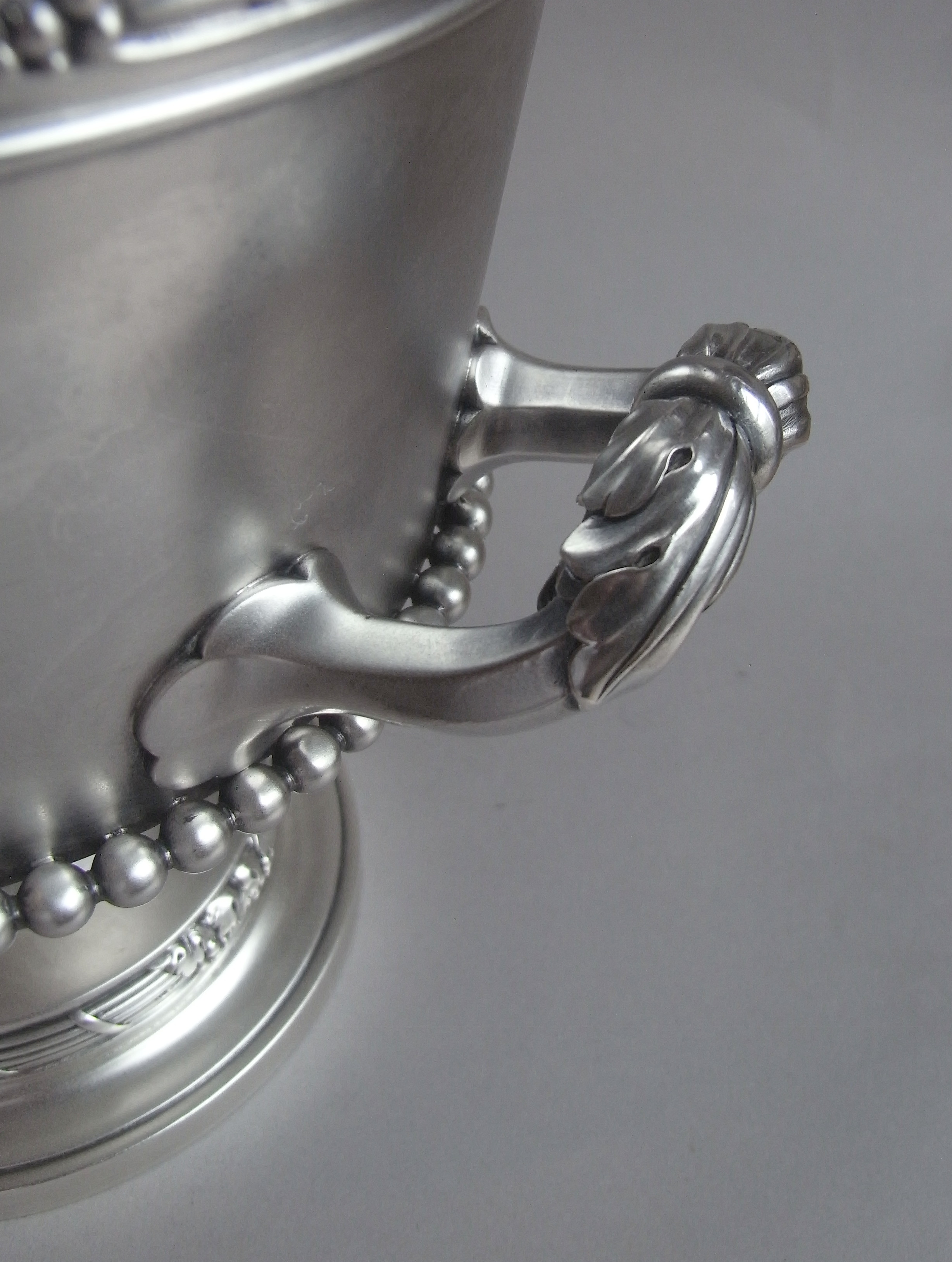 The Wine Cooler stands on a stepped circular foot decorated with a band of reed and tie designs interspersed with fruiting vines. The foot rises to an everted egg and dart band and the underside of the body is decorated with lobing. The main body is modelled in the campana form with an upper frieze of reed and tie, again, interspersed with fruiting vine. The faceted side handles are decorated with bound leaf capping and the sides rise to an everted egg and date rim. The front and reverse is engraved with a double Crest, with the Motto’s engraved below on a banner. This is all surrounded by a cartouche of pluming scrolls. The removable collar is also engraved with a double Crest and rises to a bold applied beaded rim, which is also seen at the base of the sides. The Cooler also has a removable interior cylinder, also engraved with the two Crests and Mottos. The Cooler is in excellent condition and is fully marked on each section.