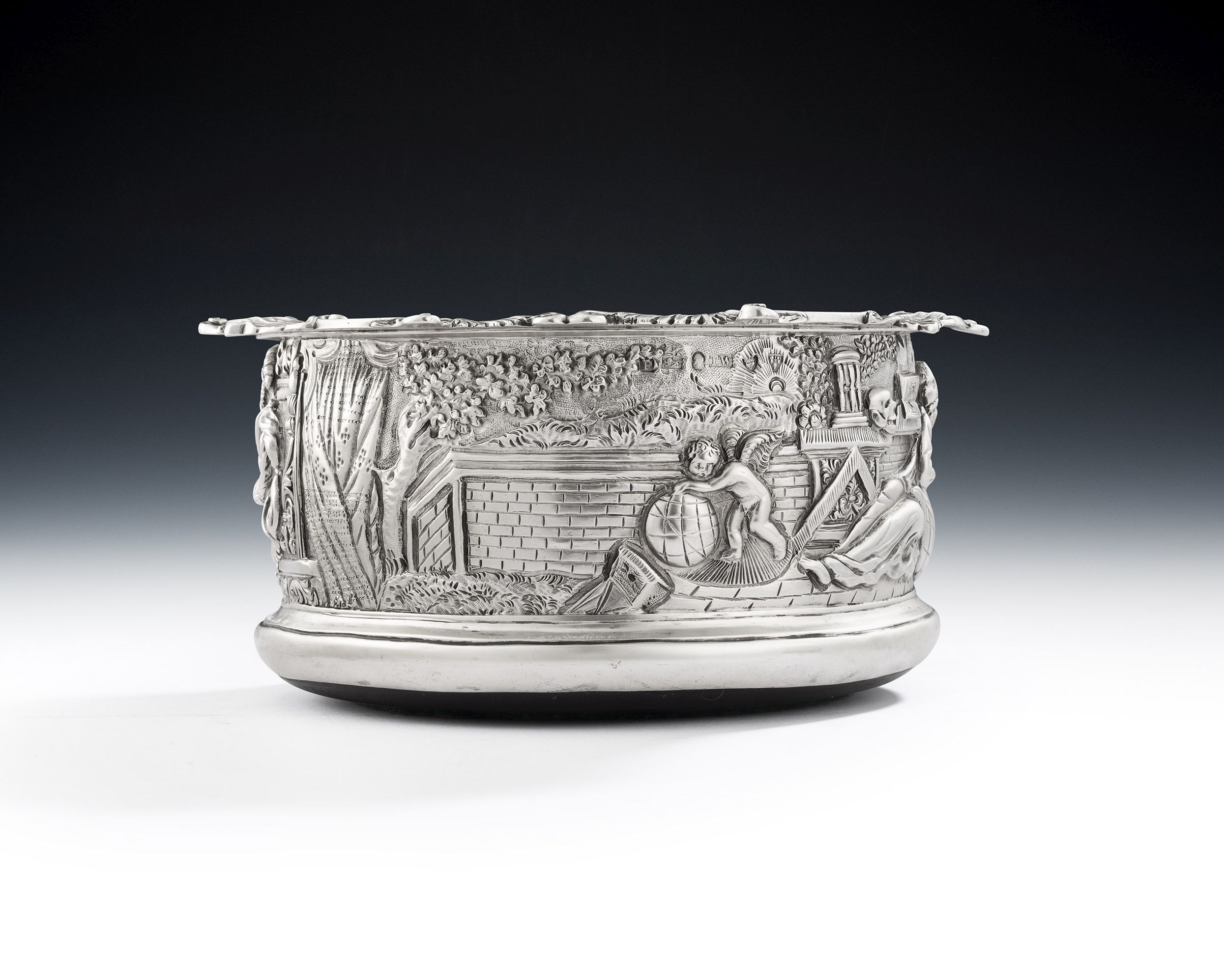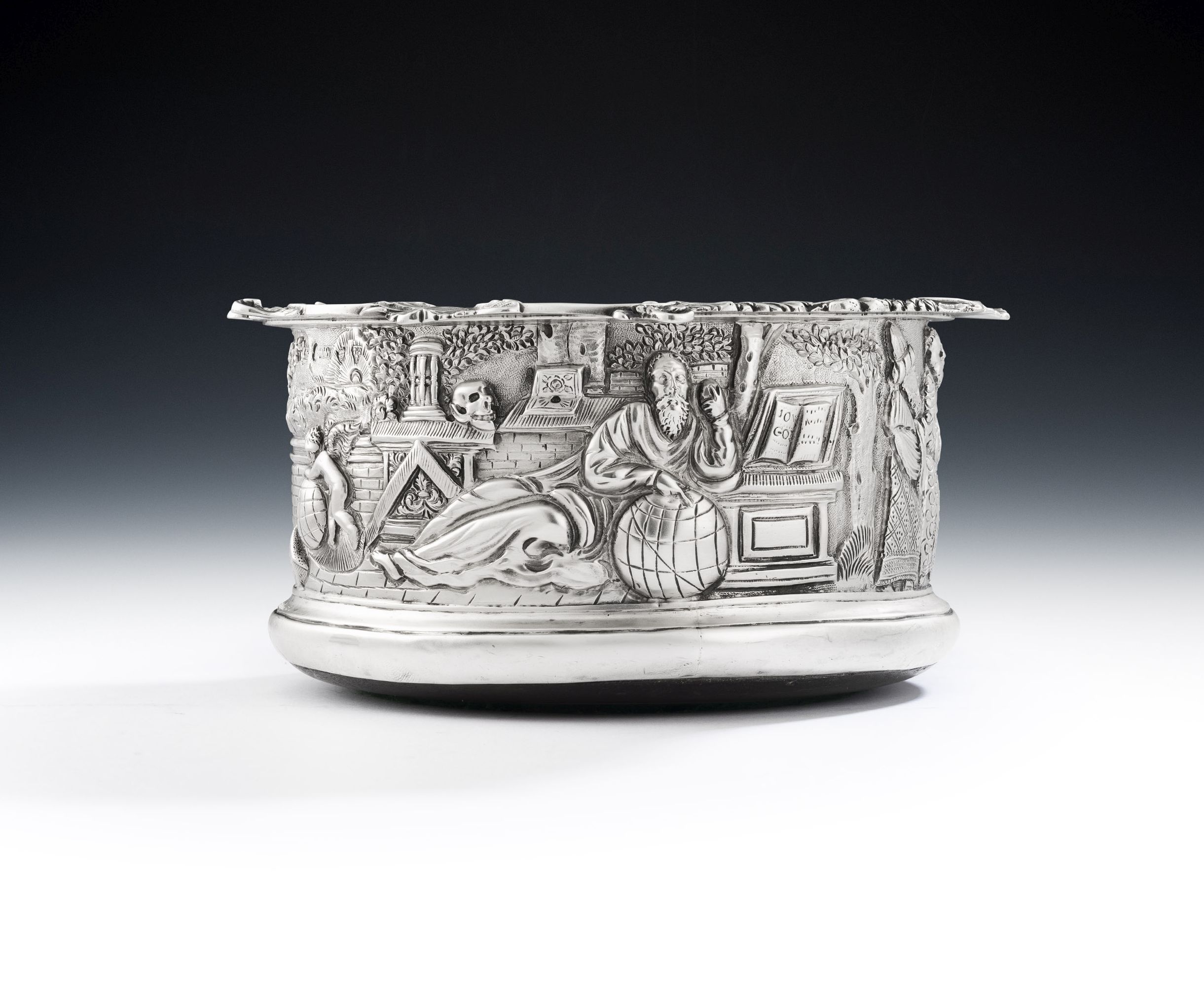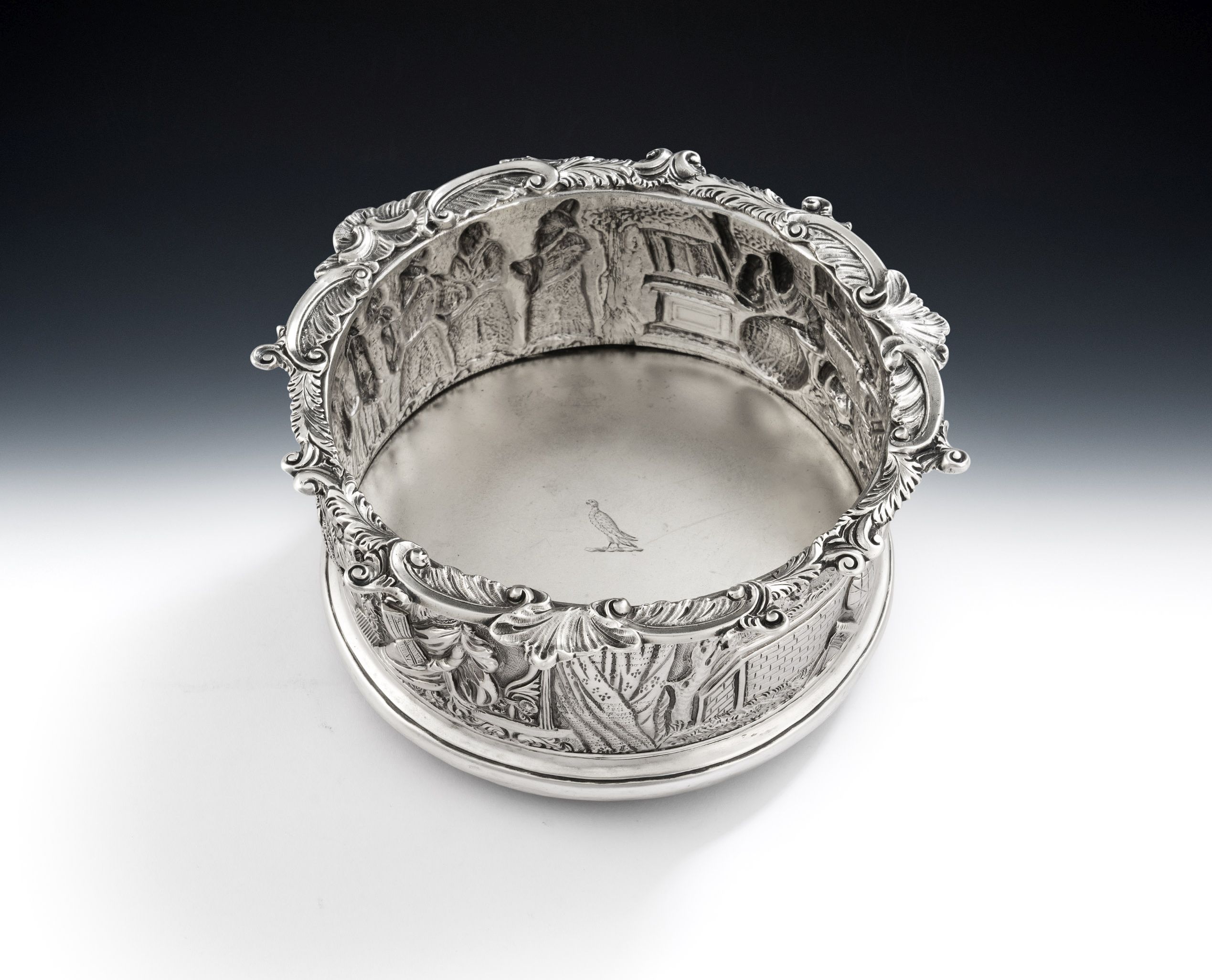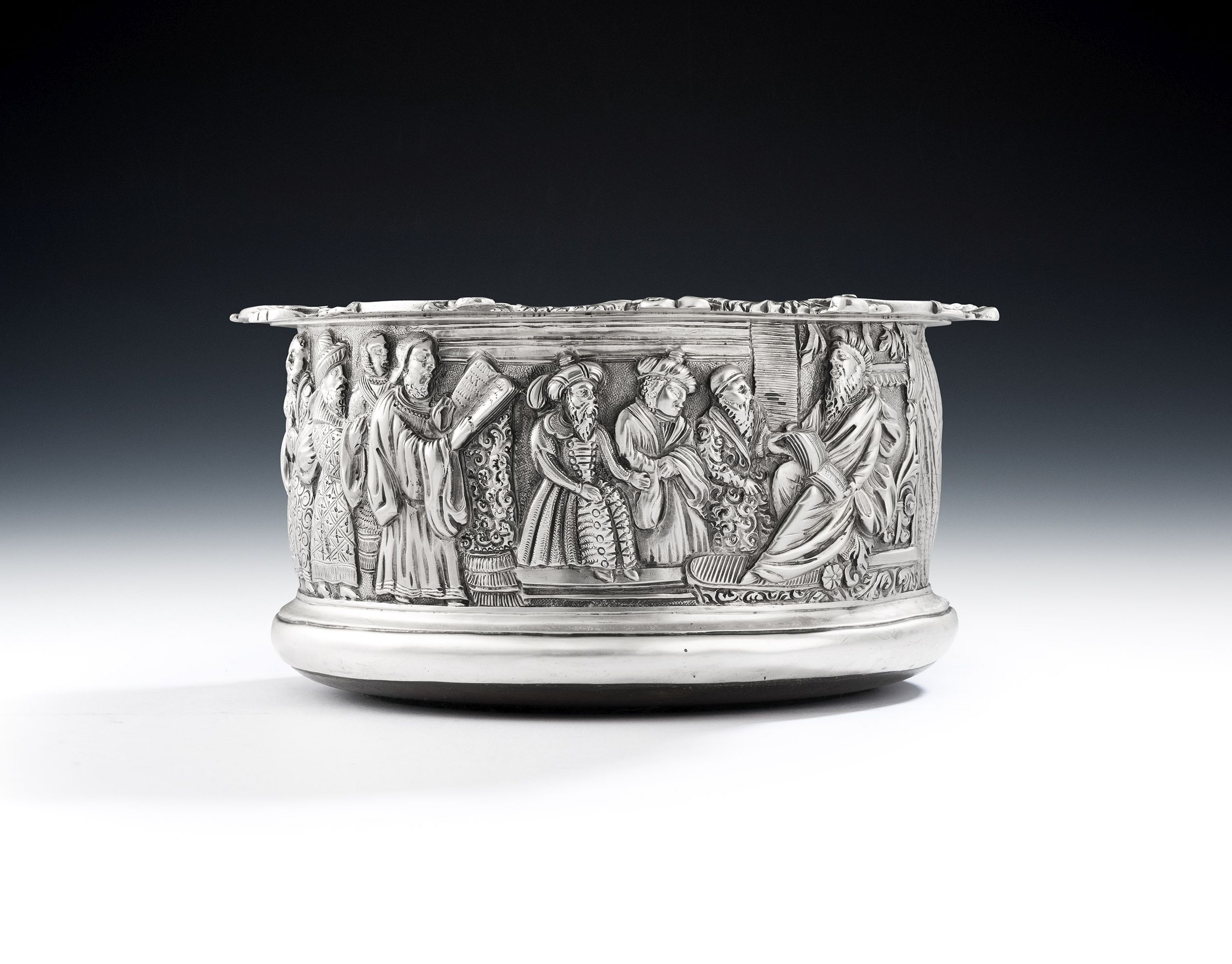 This very rare Coaster is of the magnum size, with very deep sides and an everted rim decorated with raised shells, scrolls and foliate motifs. The sides are die stamped and chased with three very unusual scenes, these being Cupid with a globe, St Augustine in his Study, which was a popular subject in Italian Renaissance painting, and finally King Solomon receiving Kings and foreign dignitaries. The chasing has been executed to the highest standard and is in excellent, crisp, condition. The detail is extraordinary, especially the clothing. The Coaster has a silver base, which was always a sign of the finest quality and is engraved with a contemporary Crest. This piece is in quite excellent condition and is fully marked on the side of the main body, in the decoration, and on the silver base.