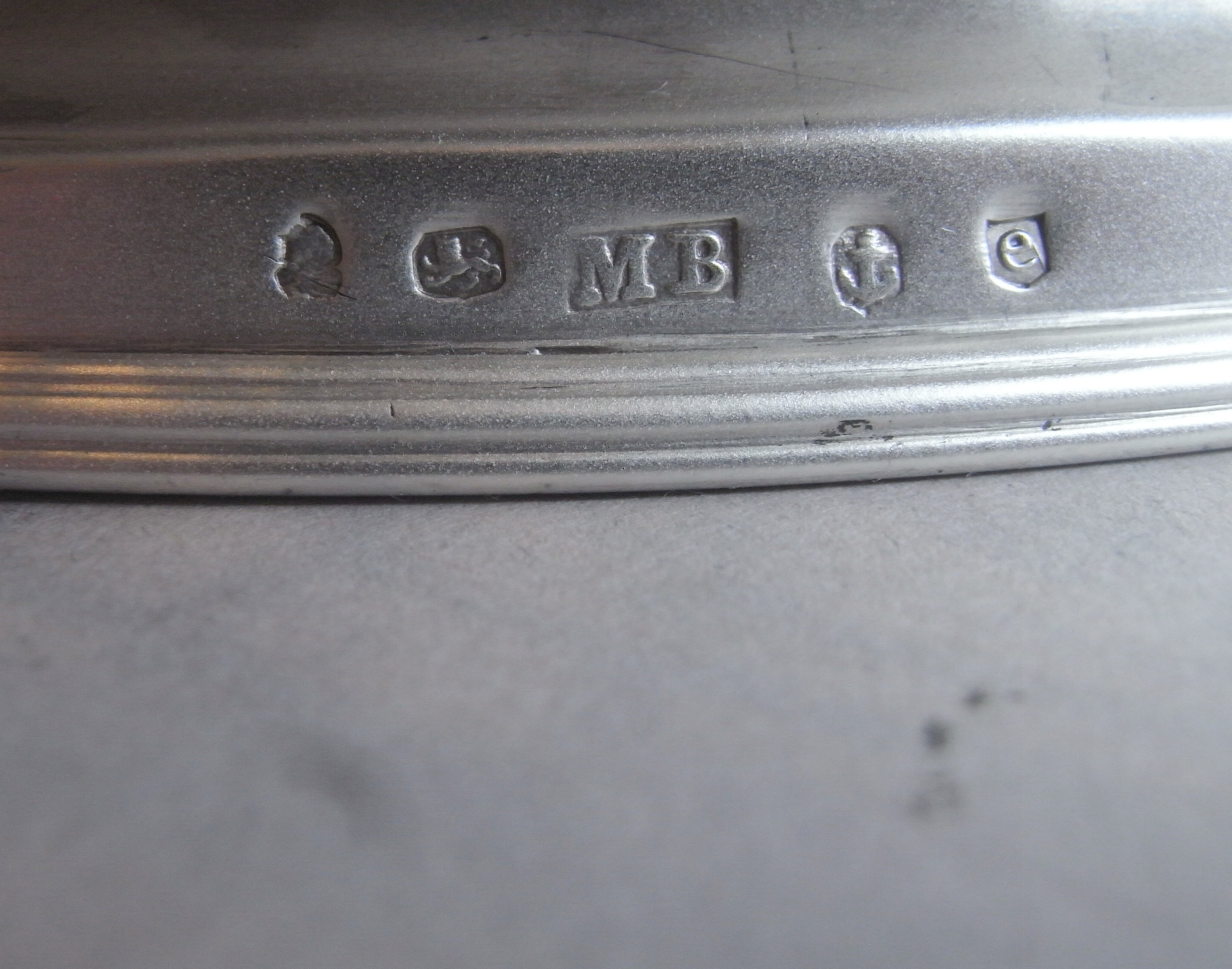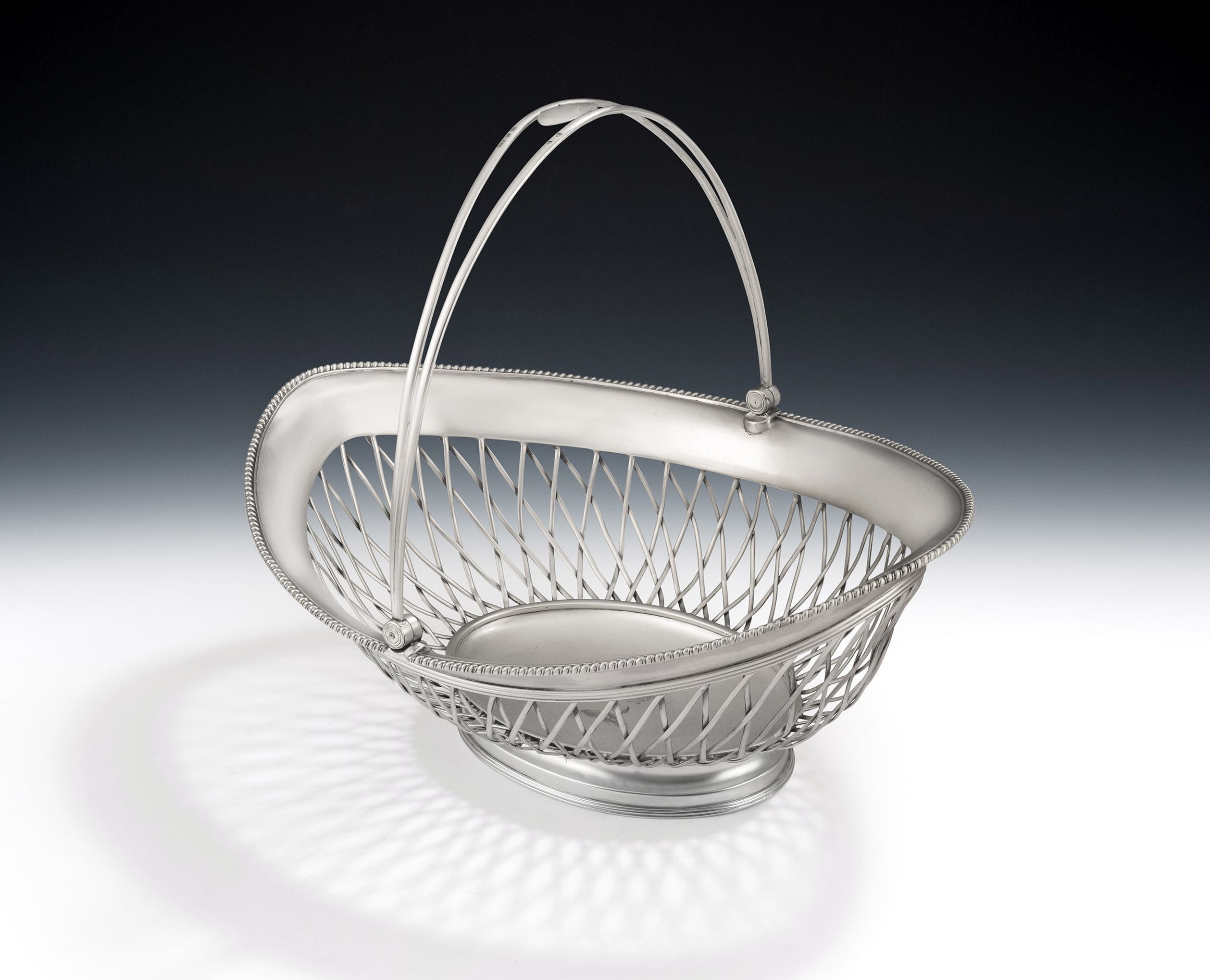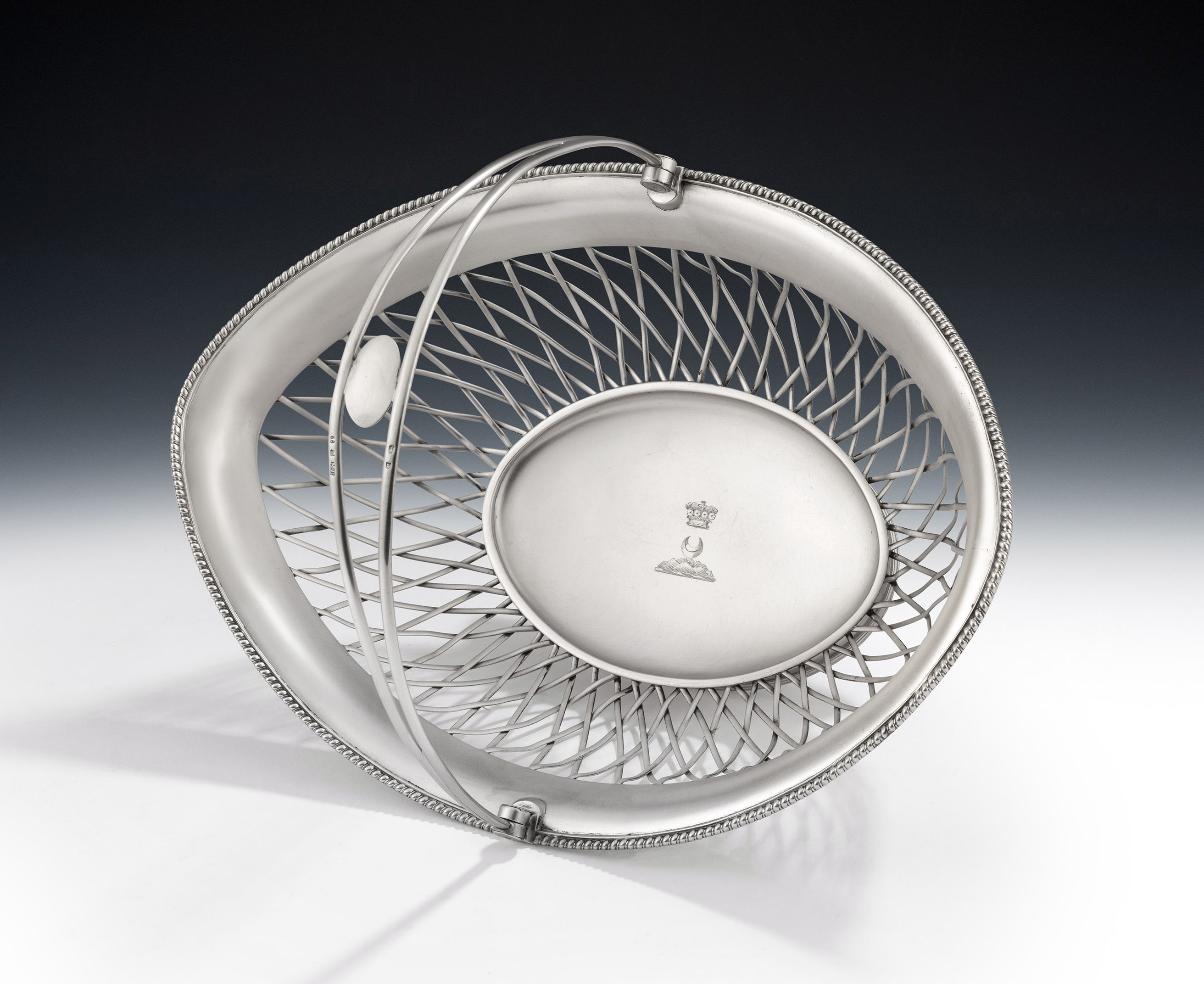 The Basket stands on an oval foot decorated with reeding. The main body has sides consisting of interlocking wirework strips made to simulate a wicker basket. The oval base is plain in design and is engraved with a Crest with the Coronet of a Baron above. The sides rise to a curved plain band, with gadrooned edge. The handle consists of two arched wirework bands, with an oval cartouche in the centre. The basket is of the finest quality in design and production and is fully marked on the handle and the foot.