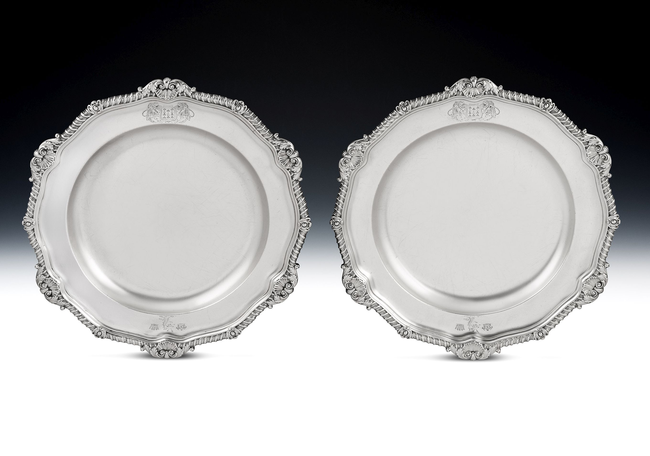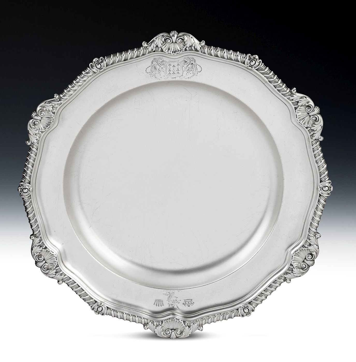 These outstanding dishes have a shaped circular rim decorated with gadrooning interspersed with raying shells, flanked by acanthus foliage. One side of the border is engraved with a contemporary Armorial surrounded by a cartouche of drapery mantling and the other side with a contemporary Crest with the Coronet of a Baron and a Viscount each side. The dishes are in excellent condition and are of an outstanding weight and gauge. Both are well marked on the reverse.