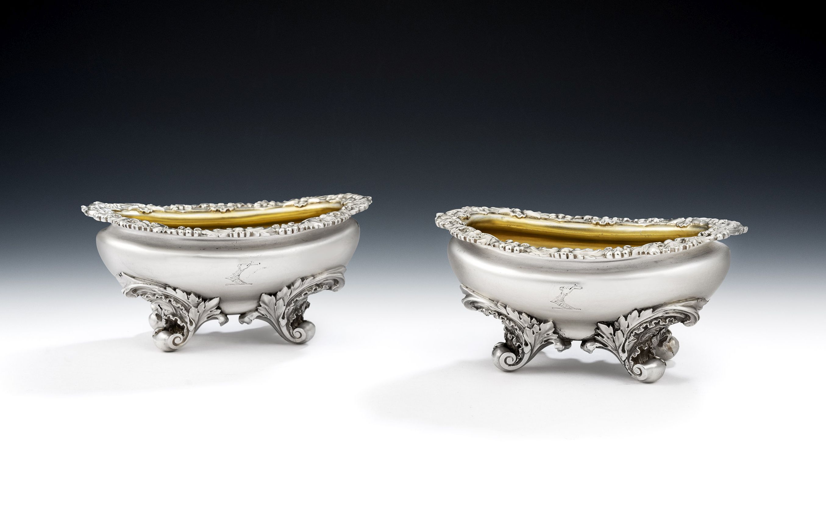 The Salt Cellars are of an outstanding weight and are modelled in a shaped rectangular form, with tapering, baluster, sides. Each stands on four scroll feet, attached to the main body with very finely detailed acanthus foliate scroll mouldings. The sides rise to an everted rim, decorated with Rococo shells, flanked by acanthus leaves, interspersed with anthemion motifs. The interiors are gilded and the front of the main body is engraved with a contemporary Crest. Each is very well marked on the base and both are in outstanding condition, being of a very good weight. The base also displays the pattern number "50" used in the Paul Storr Workshops.