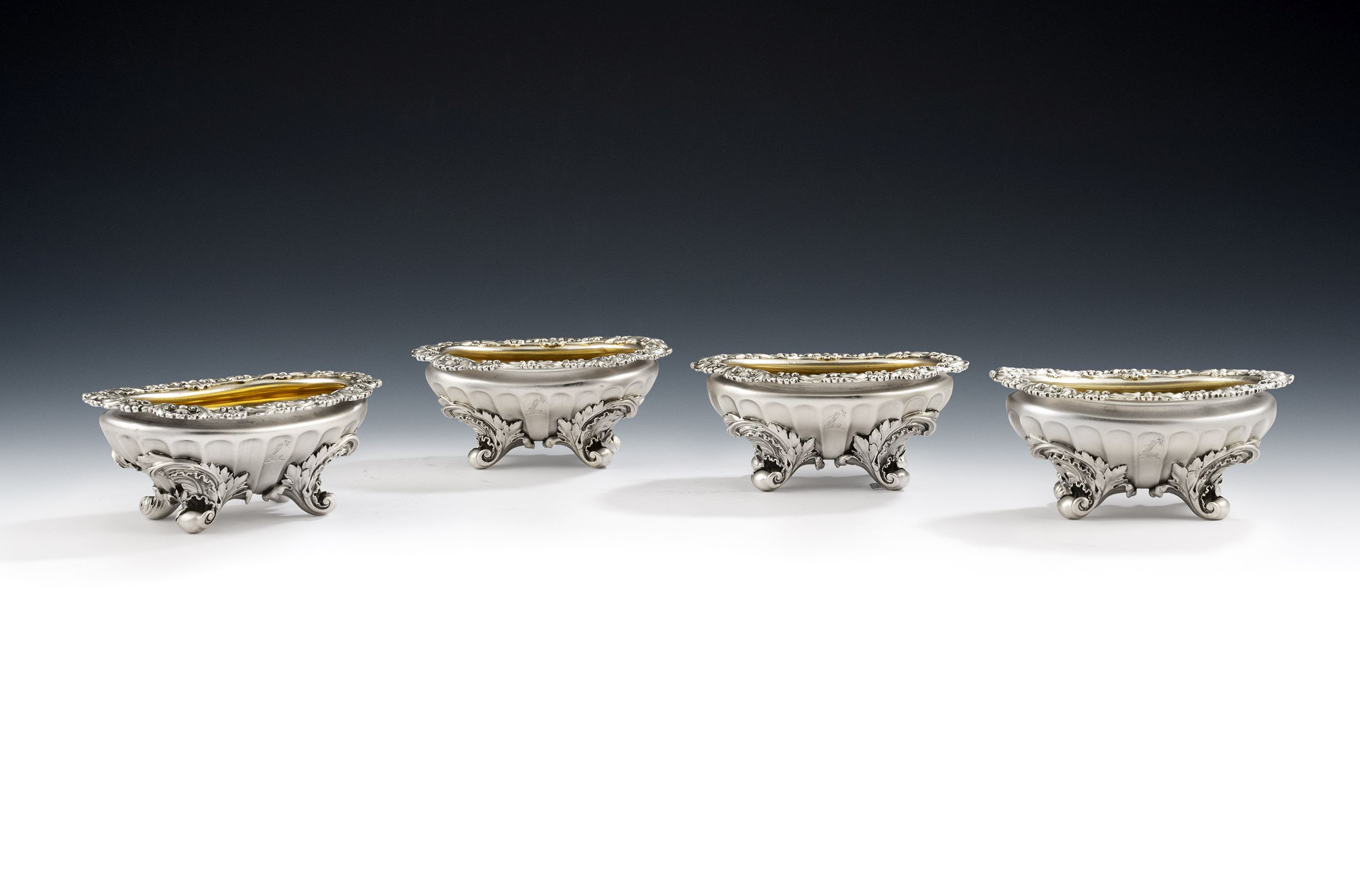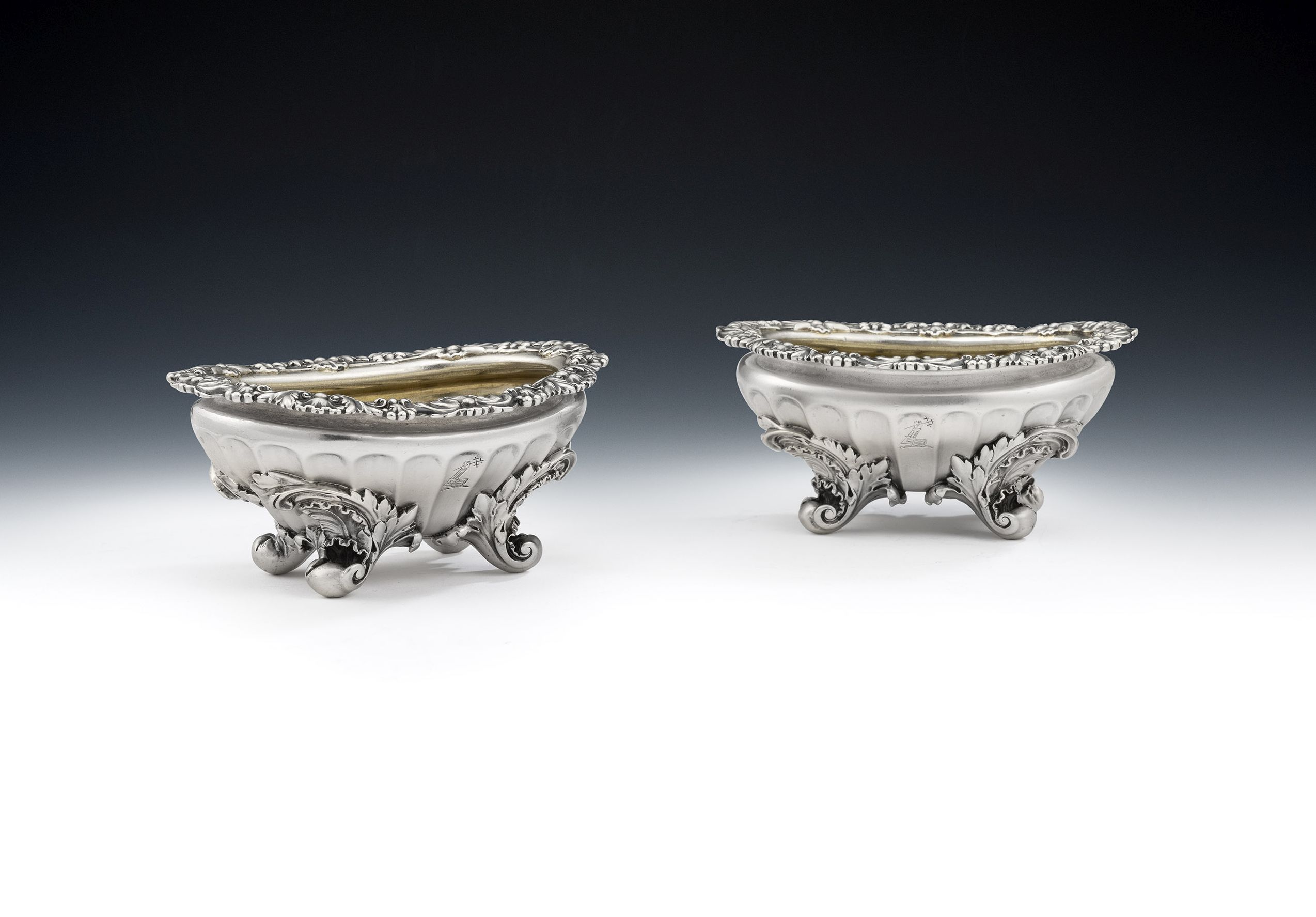 The Salt Cellars are of an outstanding weight and are modelled in a shaped rectangular form, with tapering, baluster, sides decorated with flat fluting. Each stands on four scroll feet, attached to the main body with very finely detailed acanthus foliate scroll mouldings. The sides rise to an everted rim, decorated with Rococo shells, flanked by acanthus leaves, interspersed with anthemion motifs. The sides are gilded and the front of the main body is engraved with a contemporary Crest. Each is very well marked on the base and both are in outstanding condition, being of a very good weight.