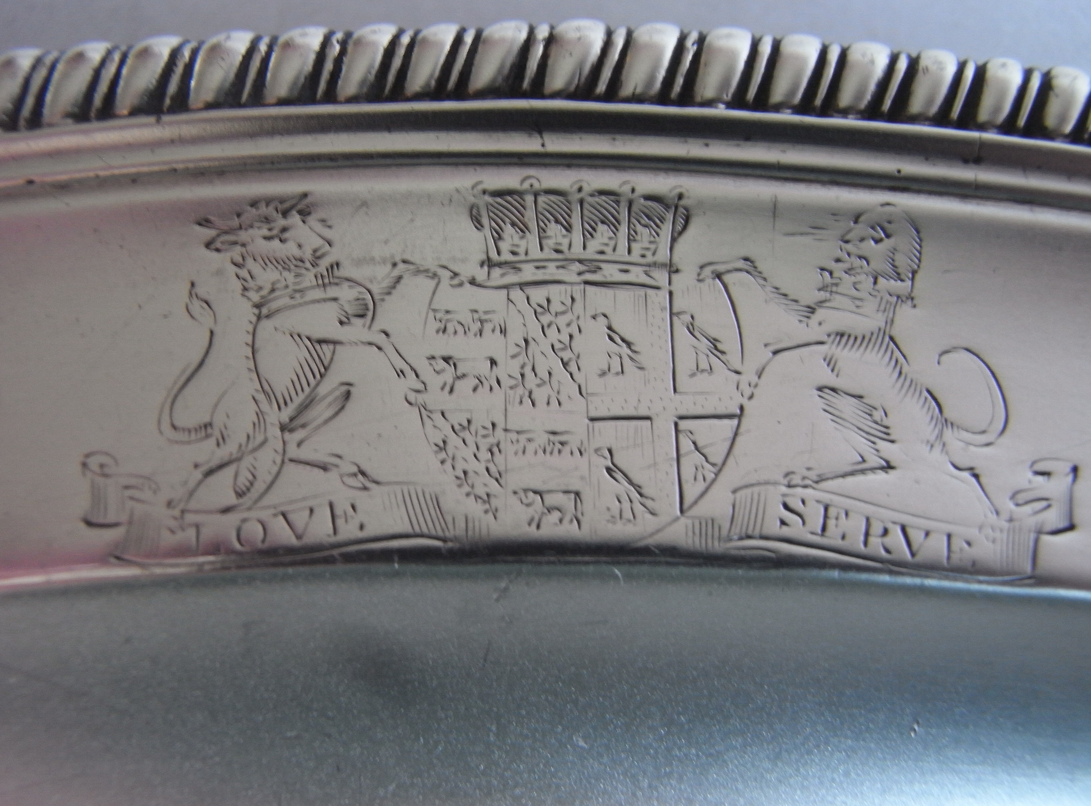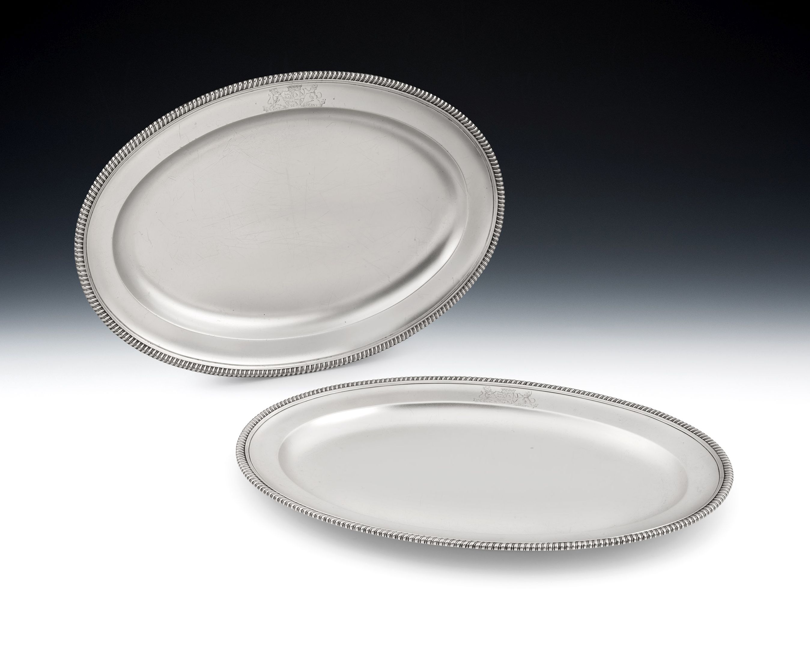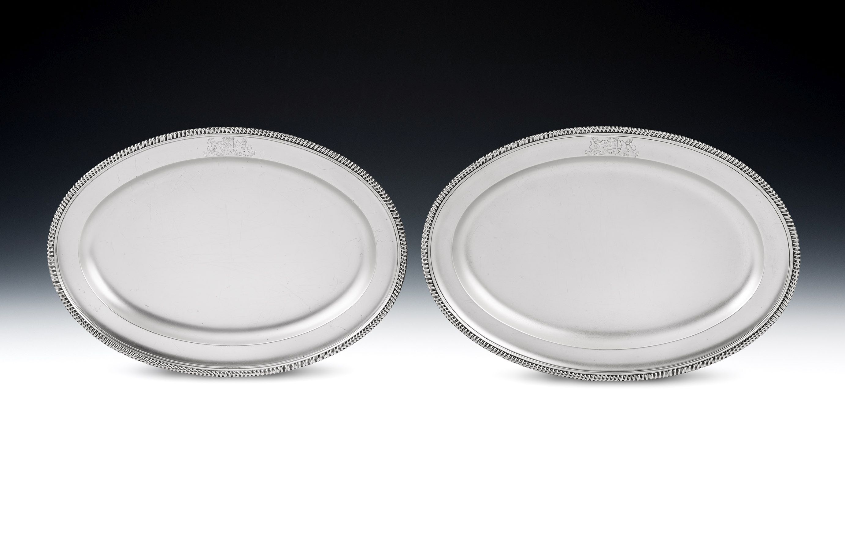 The Dishes are oval in form with a raised border decorated with applied gadrooning. The borders are engraved with a contemporary Armorial with Motto below and the Coronet of an Earl above, this is all flanked by a supporter on each side. The dishes are in excellent condition and of the finest quality. They are well marked on the reverse as well as being engraved with their original weight and their number within the dinner service.