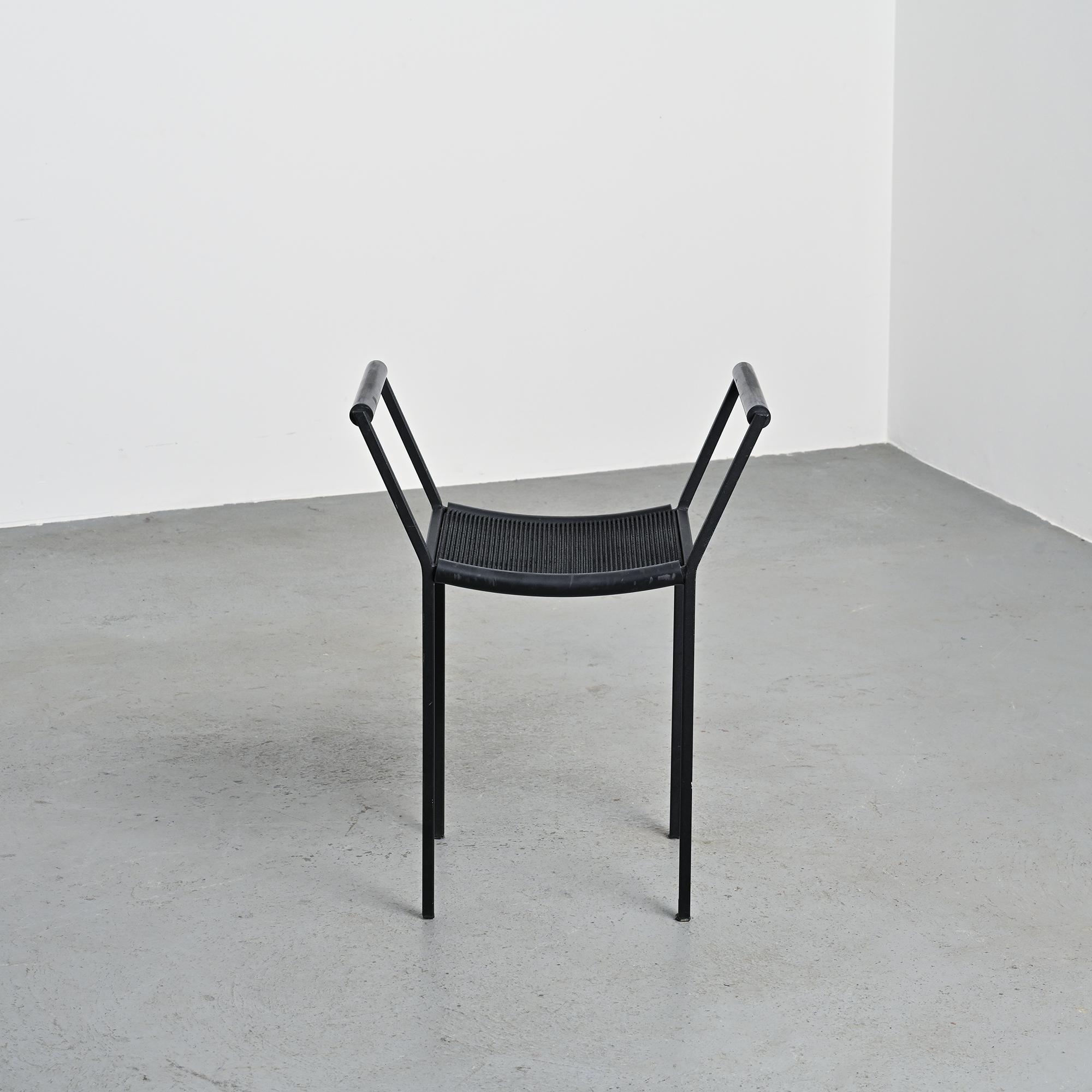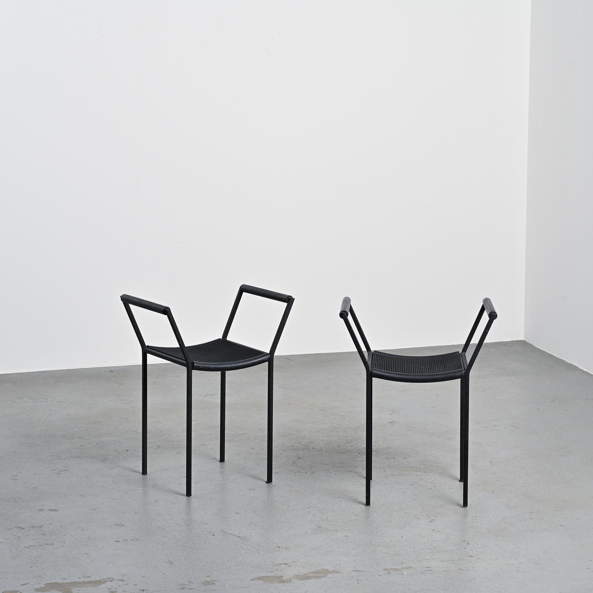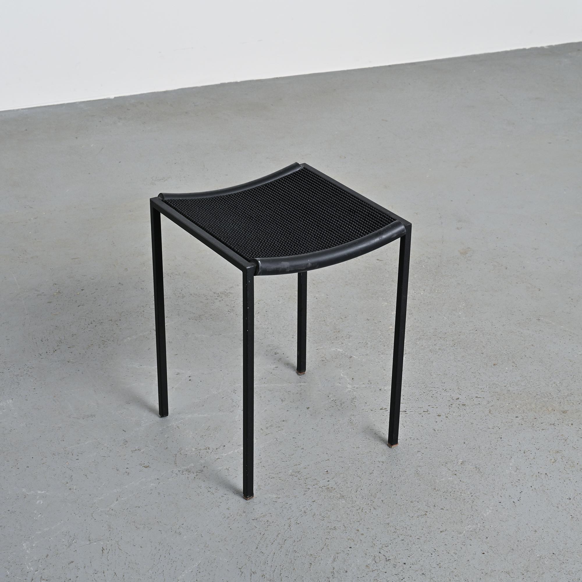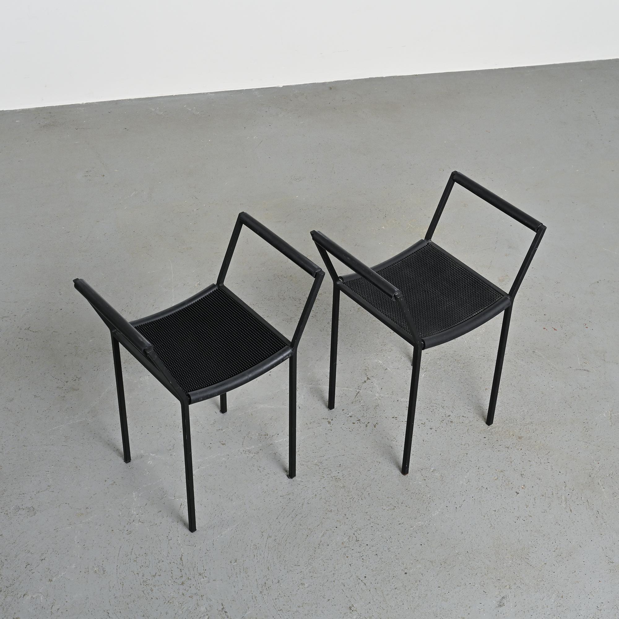 Each stool features a black lacquered metal tripod base, a structural hallmark of the Millepunte series. The seat is formed by a stretched rubber band connecting the supporting points, expressing a deliberately industrial approach to furniture design. The composition relies on a reduced formal language, combining visual lightness, stability and structural clarity. The contrast between rigid metal and flexible rubber defines the radical identity of the set.