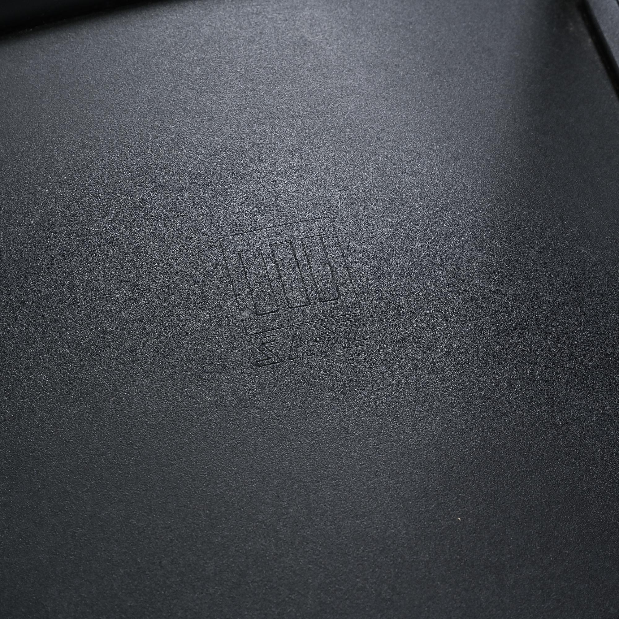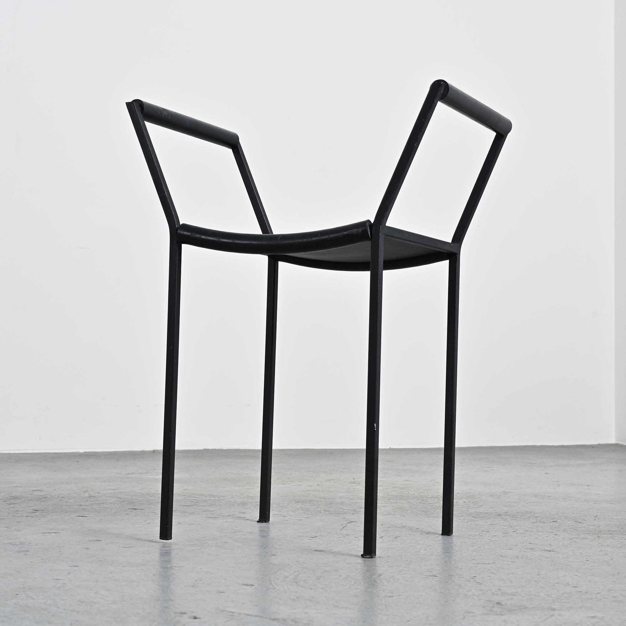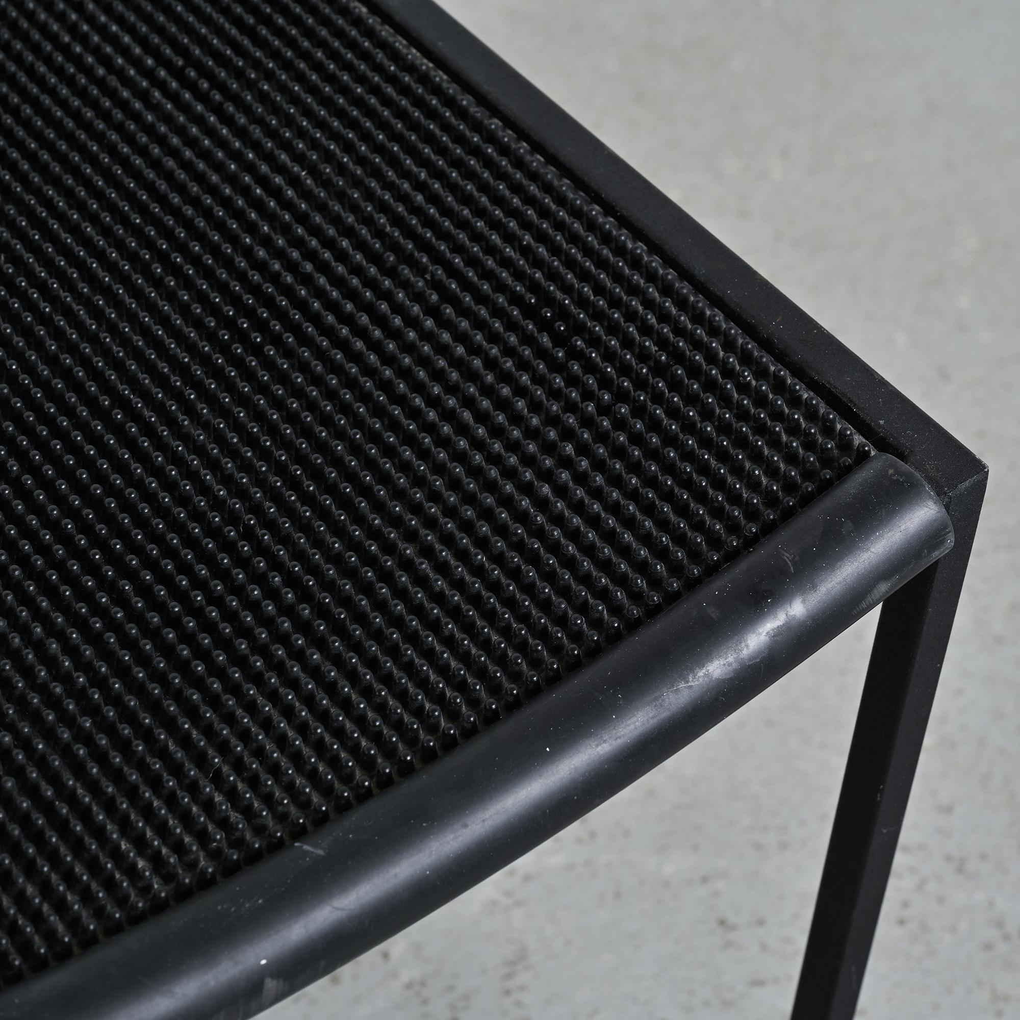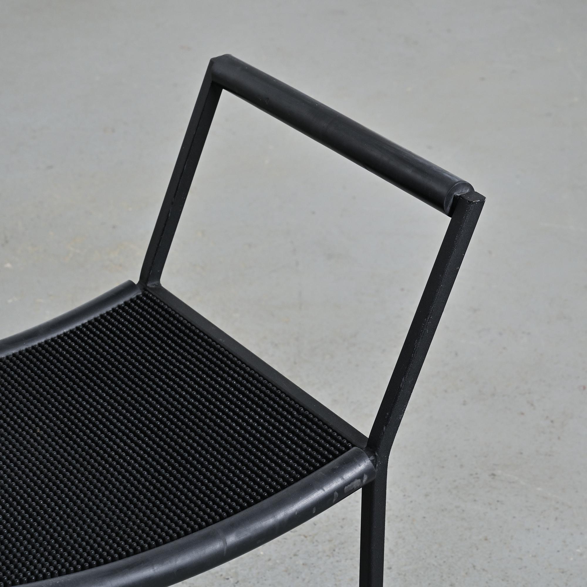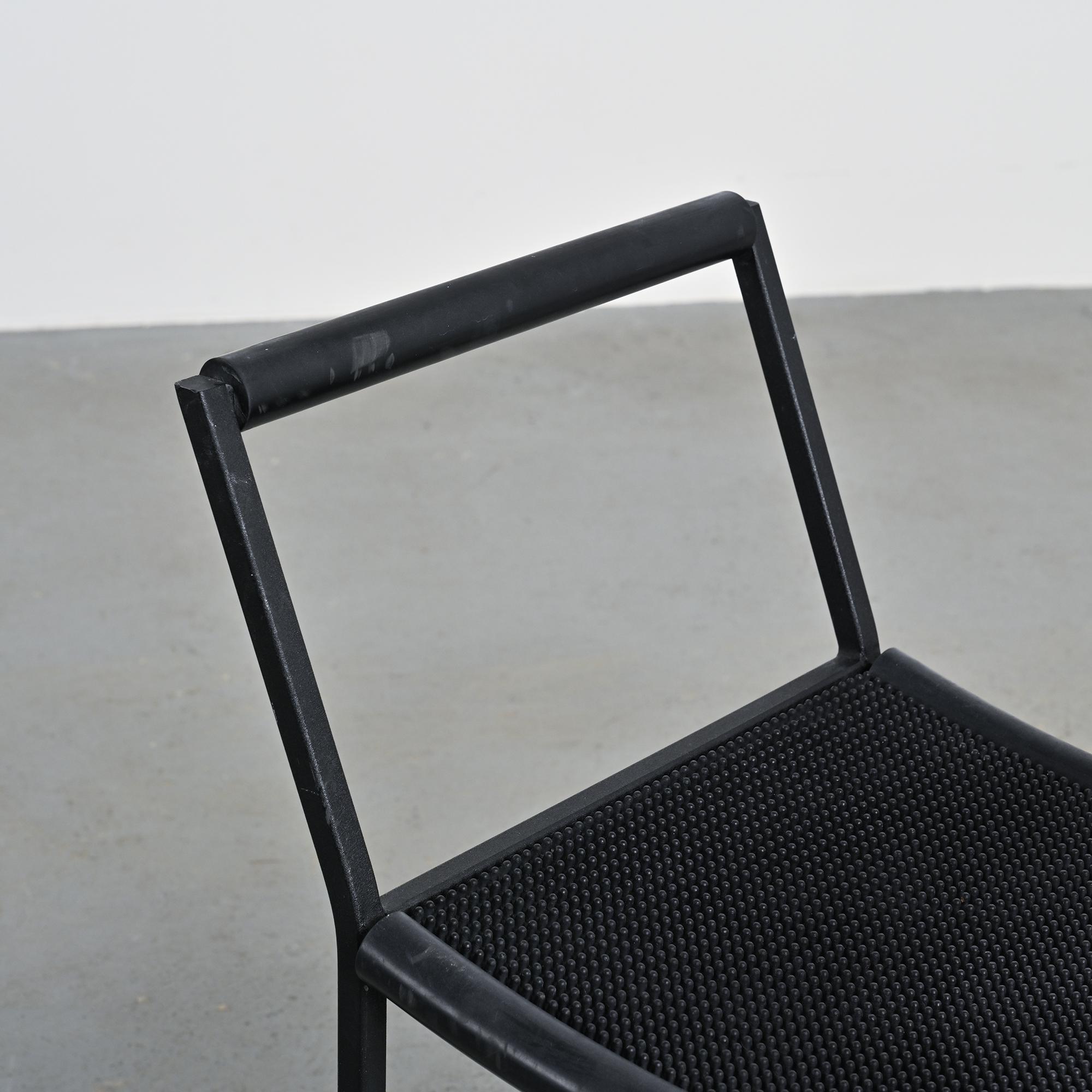 Each stool features a black lacquered metal tripod base, a structural hallmark of the Millepunte series. The seat is formed by a stretched rubber band connecting the supporting points, expressing a deliberately industrial approach to furniture design. The composition relies on a reduced formal language, combining visual lightness, stability and structural clarity. The contrast between rigid metal and flexible rubber defines the radical identity of the set.