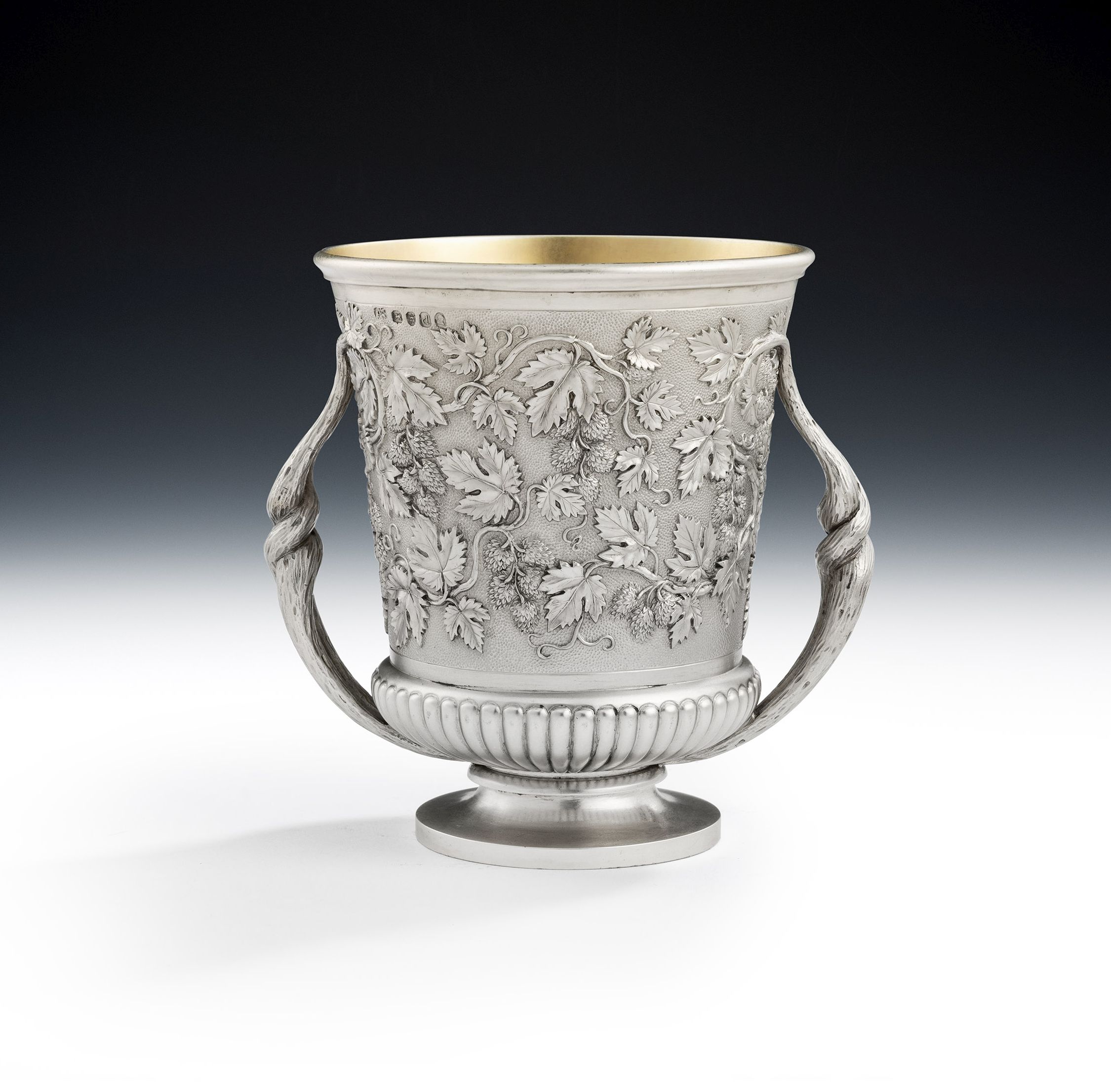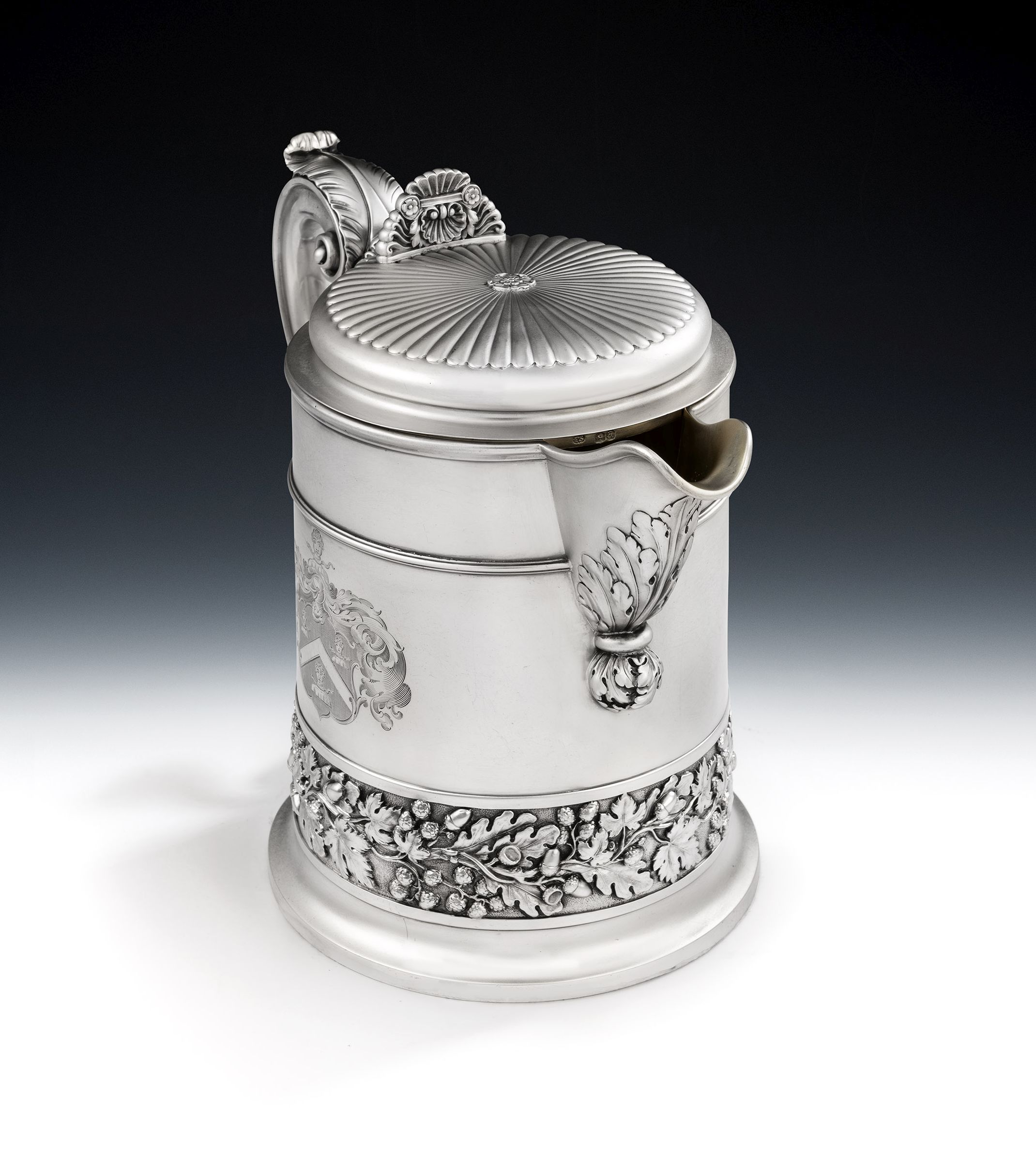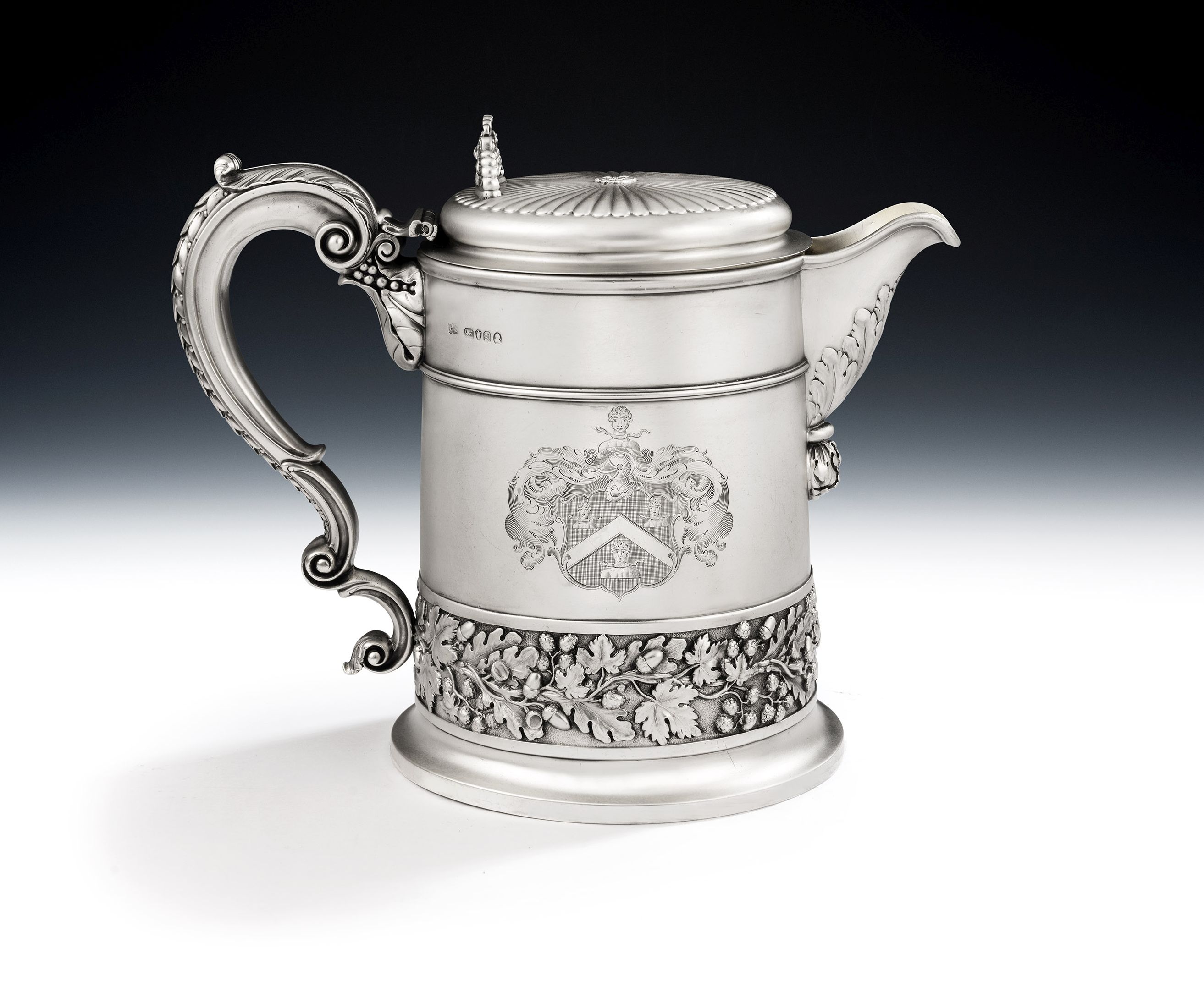 This magnificent piece has a large, slightly tapering, form with spreading foot and lower frieze decorated with a wide band of trailing acorns, oak leaves and hop bines, in raised relief on a matted ground. The hinged cover is decorated with radiating gadroons centred by a Tudor Rose motif. The cast thumb piece is decorated with a Rococo shell, flanked by scrolls and flower heads. The cast spout is chased with formal acanthus foliage. The substantial scroll handle displays fruiting foliate mouldings, where it is attached to the main body, and is decorated with leaf capping and a berried laurel band down its length. The front of the Jug is engraved with a contemporary Armorial, with Crest above, all surrounded by a pluming scroll cartouche. The Arms and Crest are those of Vaughan of Court Field, Herefordshire . They are specifically those of William Michael Thomas Vaughan (1781-1861). The family were prominent Catholics.